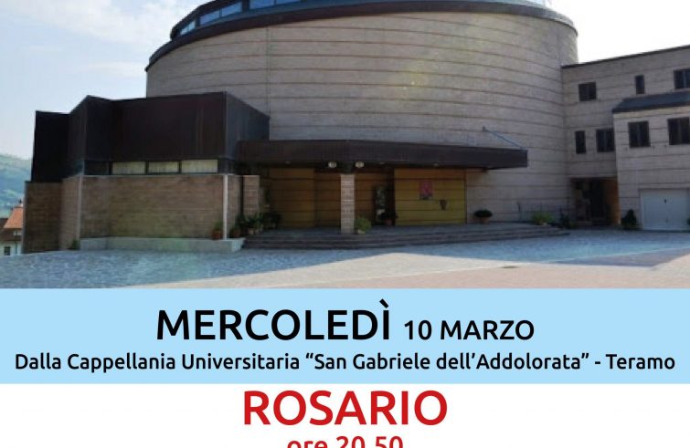 Torna l’appuntamento con “Prega con noi”. Tv2000 e InBlu2000 invitano i fedeli, le famiglie e le comunità religiose a ritrovarsi, mercoledì 10 marzo alle 20,50, per recitare insieme il Rosario che verrà trasmesso da Tv2000 (canale 28 e 157 Sky) e InBlu2000 e su Facebook. La preghiera sarà trasmessa dalla Cappellania universitaria nella parrocchia di San Gabriele dell’Addolorata in Colleparco di Teramo, intitolata al santo patrono della gioventù, in onore del quale nella diocesi si è appena celebrato l’inizio dell’anno giubilare per il centenario della canonizzazione. Durante la recita del Rosario, presieduta da mons. Lorenzo Leuzzi, vescovo di Teramo-Atri, verrà esposto sull’altare il busto con la reliquia di San Gabriele e saranno presenti cinquanta giovani in rappresentanza della vicina Università degli studi di Teramo, assieme al rettore Dino Mastrocola.