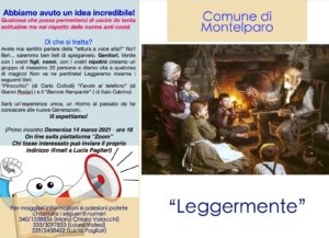 MONTELPARO – Da un’idea di Maria Chiara Valacchi e Laura Vallesi, è in partenza a Montelparo, con il primo incontro in Modalità Digitale di Domenica 14 marzo 2021 alle ore 18, il progetto “Leggermente”, “Lettura a voce alta”!