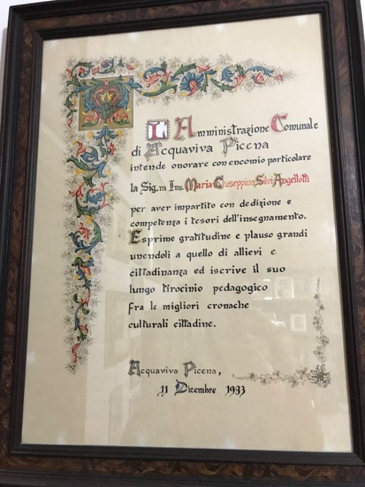 Quando Maria Giuseppina venne alla luce, un 18 marzo di tanti anni fa ad Ascoli Piceno, suo papà, Luigi Silvi, nel prenderla tra le mani esclamò raggiante: “È bella come una bambola!”. Da allora, ogni volta che i loro sguardi si incrociavano, le sussurrava dolcemente: “Sei la mia Pupa!”. Era appena trascorso un anno quando una brutta malattia le portò via il suo papà e da allora, anche in suo ricordo, è Pupetta per tutti. Soffrì come molti, assieme alla sua famiglia, nei difficili anni della guerra, ma nonostante la forzosa interruzione dovuta al periodo dello sfollamento, non abbandonò mai gli studi conseguendo brillantemente il diploma magistrale. Si era appena iscritta alla Facoltà di Magistero, indirizzo Lingue e Letterature straniere della Ca’ Foscari di Venezia quando, appena ventenne, vinse il concorso per l’insegnamento, ottenendo il primo incarico a Montedinove. Iniziarono per lei lunghi viaggi quotidiani come pendolare da San Benedetto a Montedinove, passando per l’interno su un’affollata corriera; la stessa che un bel giorno si fermò per un guasto proprio ad Acquaviva Picena. E galeotta fu l’avaria, perché proprio in quel giorno incontrò il suo Peppino (al secolo Giuseppe Angellotti, Medico Veterinario che qualche anno dopo, precisamente nel 1961, fonderà proprio lì la Cantina Sociale dei Colli di Acquaviva Picena di cui ne sarà integerrimo Presidente fino alla fine degli anni novanta). Fu amore a prima vista e nei due anni che precedettero la loro unione, si scambiarono intense e bellissime lettere che Pupetta conserva ancora gelosamente nella “sua scatola”. Dalla loro unione sono nati quattro figli: Maria Pia, Antonio, Maria Antonietta e Luigi Aspreno. La Maestra Pupetta continuerà ad insegnare a Montedinove fino alla nascita della primogenita, percorrendo quotidianamente il consueto tragitto in corriera con il suo pancione ogni giorno sempre più grande. Poi arrivò un primo trasferimento nella scuola pluriclasse della “Contrada Merli” di Ripatransone, seguito da un secondo nelle pluriclassi delle scuole di campagna dell’acquavivano. Finalmente, nel 1960, approdò nella scuola elementare di Acquaviva Picena dove insegnerà ininterrottamente fino alla pensione. Dei suoi alunni ha un ricordo stupendo. Ognuno è stato per lei speciale ed unico ed ha contribuito al suo costante arricchimento interiore e umano. Ogni sera, dopo aver riordinato al cucina, preparava diligentemente le sue lezioni documentandosi sempre e non dando mai nulla per scontato. Ogni estate frequentava corsi di aggiornamento, anche a proprie spese; è stata infatti una delle prime docenti ad introdurre l’insiemistica come metodo d’insegnamento nelle classi elementari. Negli anni ’80, suo malgrado, a causa di una rara malattia che le impedì temporaneamente l’uso delle mani, decise di lasciare la scuola perché non era più in grado di dare tutta sé stessa ai suoi adorati alunni. Per fortuna questo rimane solo un brutto ricordo! Dopo gli orari di insegnamento, ha sempre condiviso e supportato l’attività di veterinario di suo marito: facendogli da segretaria; intrattenendo i clienti che avevano bisogno di parlare “col Dottore”; cucinando per i tanti suoi colleghi che, memori delle sue arti culinarie, facevano volentieri tappa quotidiana nella sua cucina nei periodi serrati delle “profilassi a tappeto”. Compagna di vita preziosa, è stata sempre vicina al suo amato marito nei sette lunghi anni della sua malattia, ricoprendolo ogni giorno di molteplici attenzioni. Ha sempre dispensato buoni consigli a tutti e ha aiutato tante giovani spose in difficoltà “ad ingranare” col proprio matrimonio. Ottimista nata dichiara, senza esitazione, di essere stata anche molto fortunata nella vita perché sempre circondata da tanti affetti. Vede il bello in tutti e non dimentica mai il prossimo. Donna instancabile, non ha mai trascurato l’educazione dei suoi figli che su di lei, come da sempre, possono ancora contare in ogni momento. Ha sei splendidi nipoti che sono sempre stati il suo orgoglio e per i quali ideò, assieme al marito, le famose “Polpette di Nonna Pupa” che hanno attraversato altri continenti. Ha sempre cercato di riunire tutta la sua numerosa famiglia, bloccata solo ultimamente dal lockdown, o semplicemente i soli nipoti per trascorrere con loro piacevoli momenti nei quali dà nuova vita ai suoi tanti ricordi e nel rievocare il passato, tiene viva la memoria del nonno. Ha sempre saputo mantenere vivi e costanti i rapporti anche con la “parte americana” della sua famiglia. Tutti i suoi cugini, nipoti e pronipoti della Pennsylvania e West Virginia, ancora molto legati alle loro origini ascolane, non esitano a farle visita quando tornano in Italia. Appassionata di lettura ed enigmistica, dotata di uno spiccato senso creativo, ama trascrivere le frasi che più la colpiscono “le sue frasi”in un quaderno che rilegge spesso nei suoi momenti privati e di riflessione. I figli scrivono di lei: Grazie mamma, grazie per averci messo al mondo e per aver avuto cura di noi; grazie per averci insegnato a stare con tutti … perché “siamo tutti uguali” e per averci educato al rispetto degli altri e, soprattutto ad affrontare la vita; grazie per averci insegnato a nuotare; per averci portato fin da piccoli nell’acqua alta col pattino per farci vincere la paura dell’acqua (che si è rivelata preziosa per affrontare le avversità della vita), tu che eri un delfino e da ragazza, come ci raccontavi, nuotavi in mare aperto. Grazie per essere stata sempre e comunque presente nei momenti di difficoltà, con il rispetto e la discrezione che ti contraddistinguono: grazie per tutto l’amore che doni incondizionatamente ai tuoi nipoti come se fossero anch’essi, anzi lo sono certamente, figli tuoi. Grazie e ancora grazie Mamma-Maestra Pupetta!