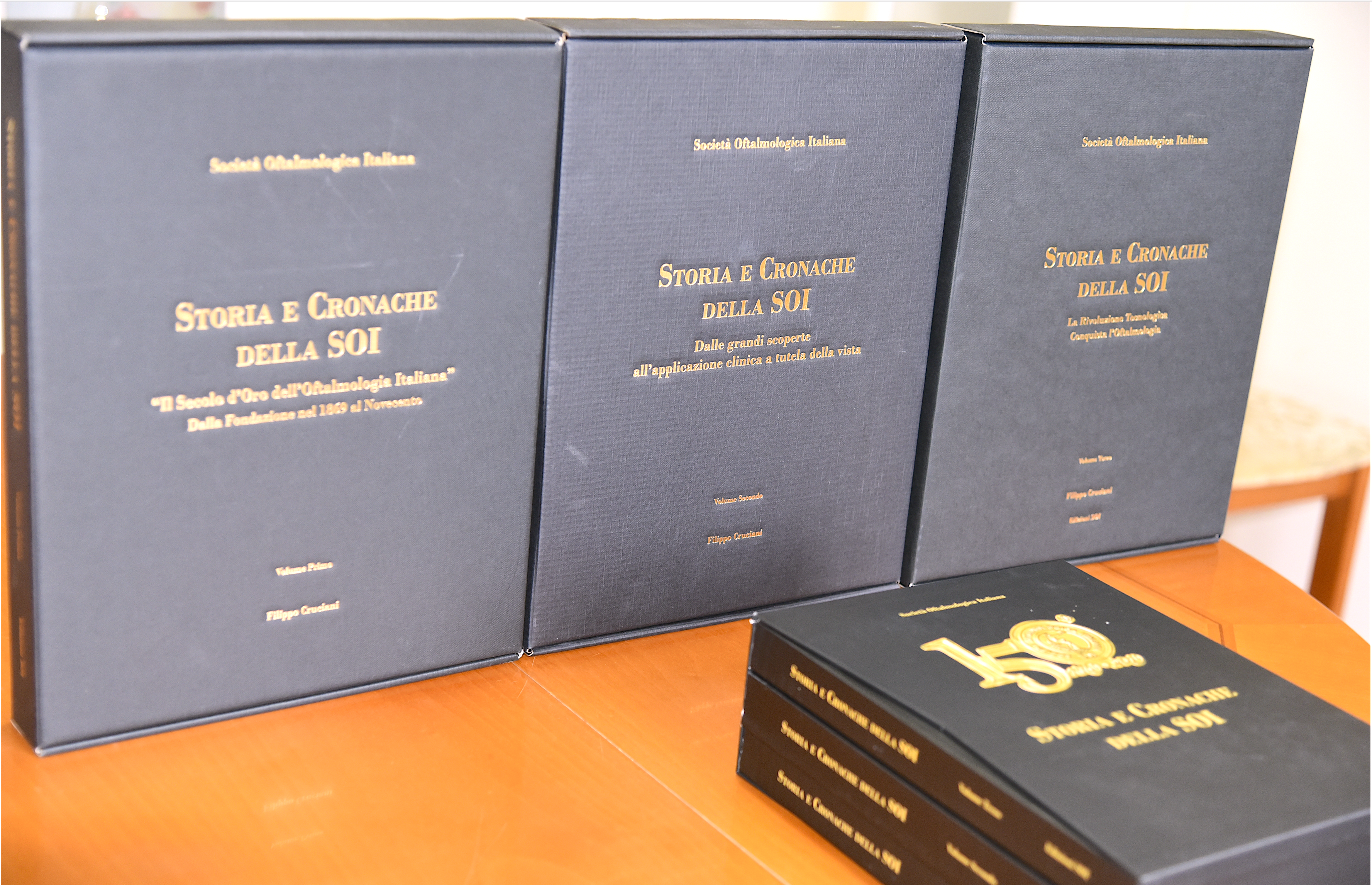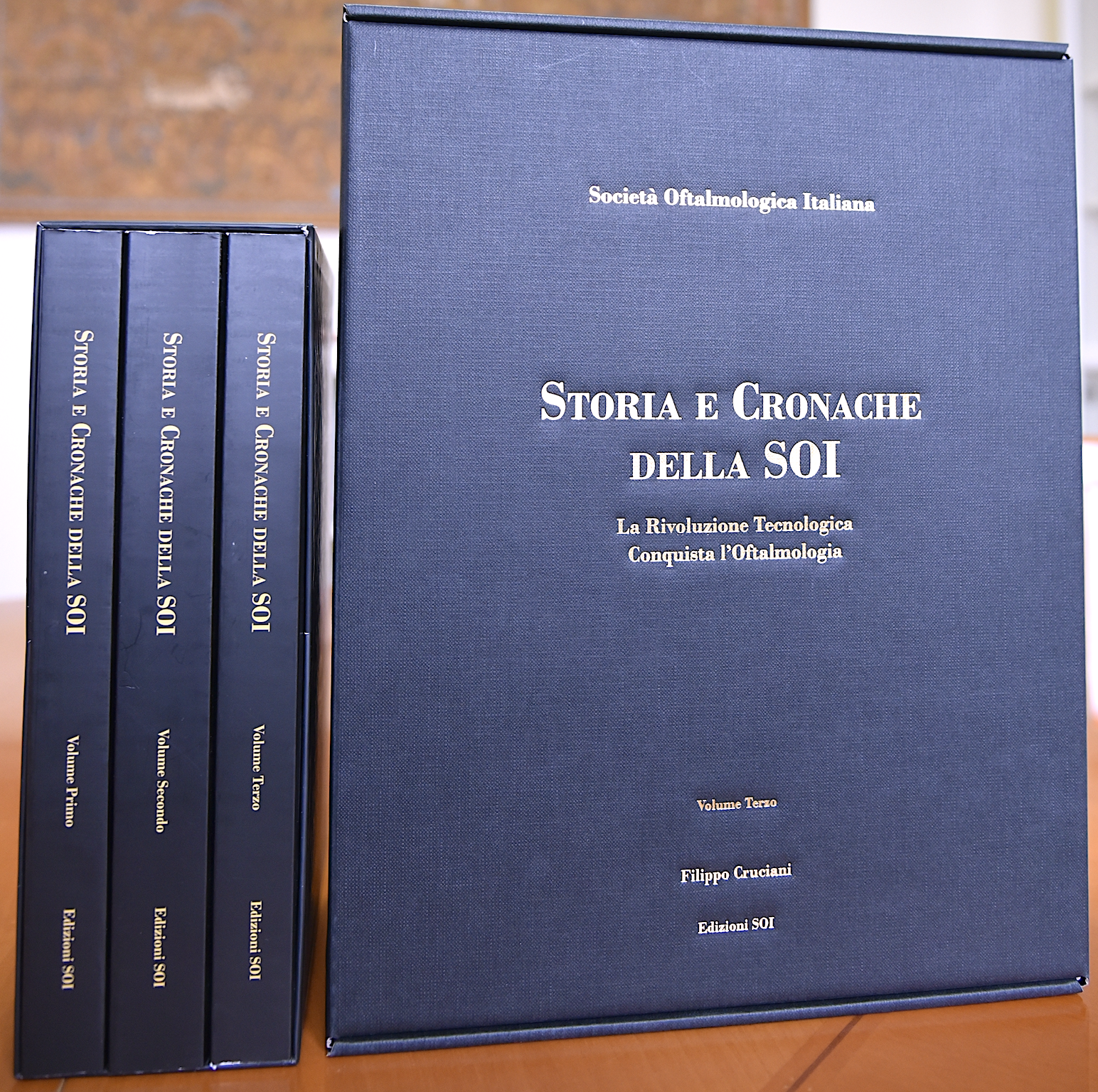 Con l’uscita del terzo e preziosissimo volume, di livello sicuramente enciclopedico, la SOI ha voluto preparare anche un cofanetto che, in dimensioni molto più ridotte, raccoglie le tre pubblicazioni. Esse saranno in questa maniera, ed a costi più accessibili, proposte ai lettori che le vorranno avere nella loro libreria per una giusta e completa informazione, scientifica e storica, in un campo delicatissimo quale quello della cura degli occhi!