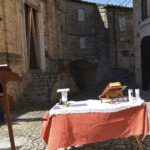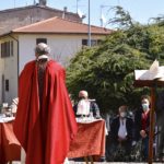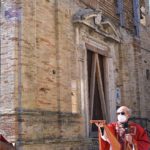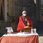 Il Priore-Parroco della Parrocchia di San Michele Arcangelo di Montelparo, Fra Emanuele D’Aniello, dopo aver fatto sistemare l’altare di fianco alla Chiesa di San Gregorio Magno, con di fronte la Piazza Cavour dove i fedeli avevano preso posizione (tutti a dovuta distanza uno dall’altro), ha celebrato la S. Messa.