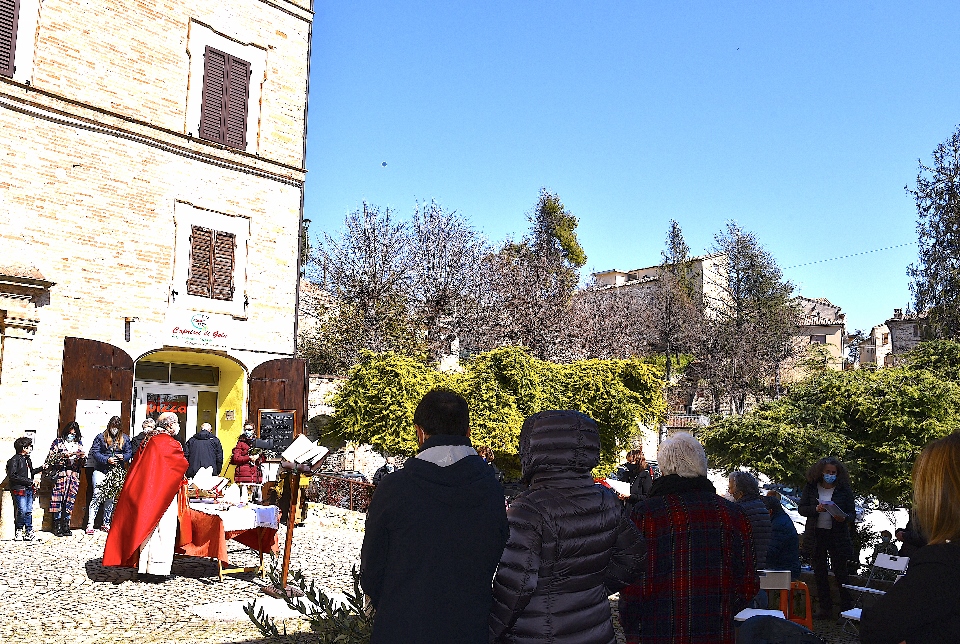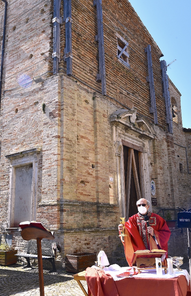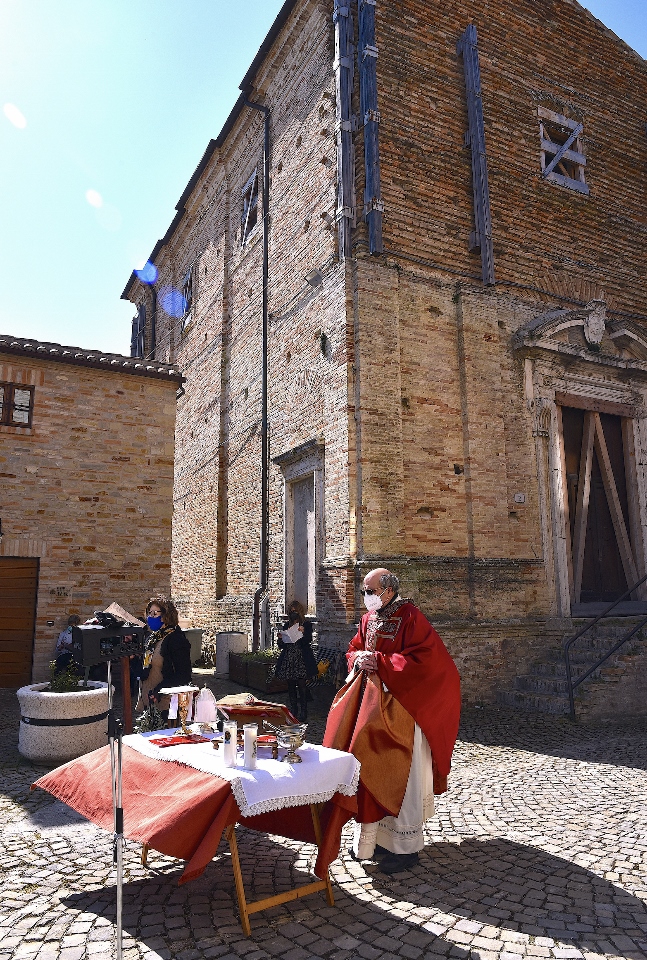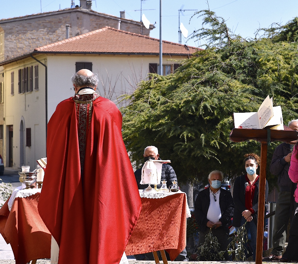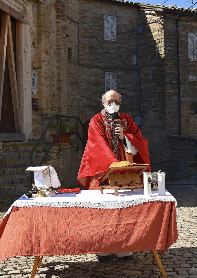 Il Priore-Parroco della Parrocchia di San Michele Arcangelo di Montelparo, Fra Emanuele D’Aniello, dopo aver fatto sistemare l’altare di fianco alla Chiesa di San Gregorio Magno, con di fronte la Piazza Cavour dove i fedeli avevano preso posizione (tutti a dovuta distanza uno dall’altro), ha celebrato la S. Messa.