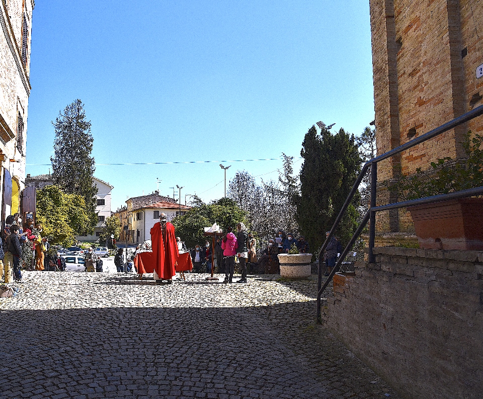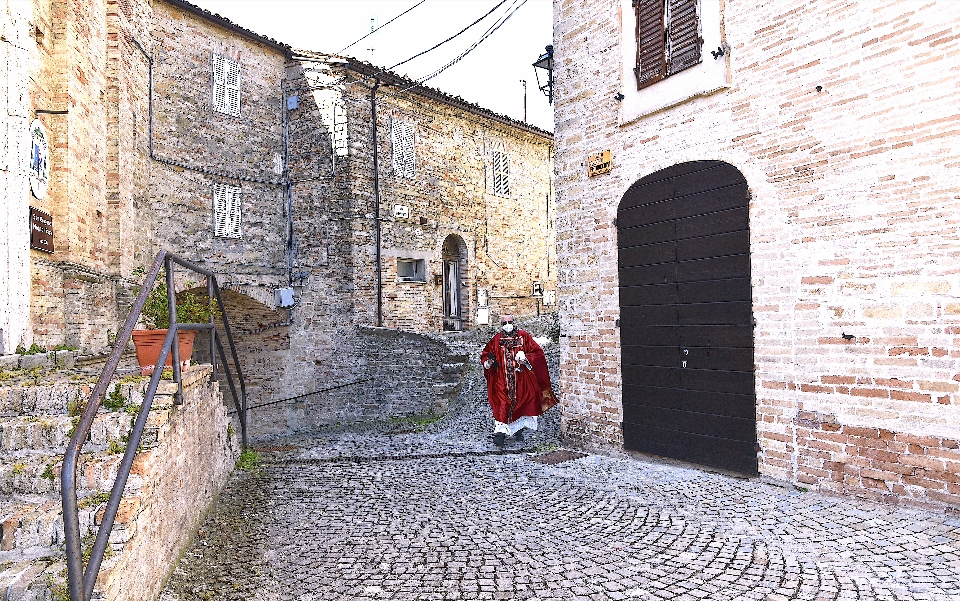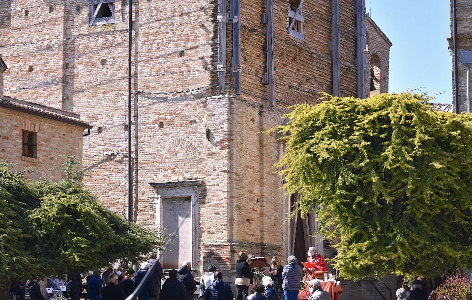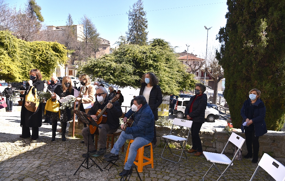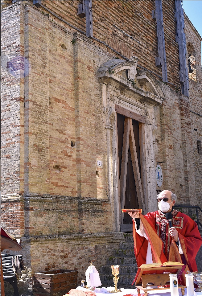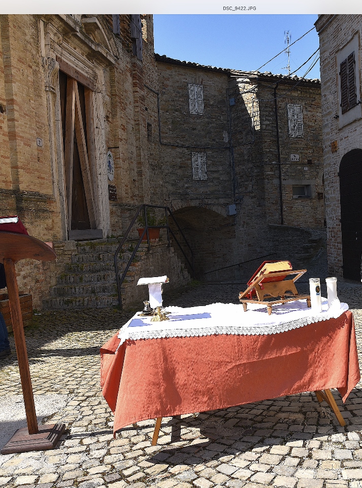 Il Priore-Parroco della Parrocchia di San Michele Arcangelo di Montelparo, Fra Emanuele D’Aniello, dopo aver fatto sistemare l’altare di fianco alla Chiesa di San Gregorio Magno, con di fronte la Piazza Cavour dove i fedeli avevano preso posizione (tutti a dovuta distanza uno dall’altro), ha celebrato la S. Messa.
