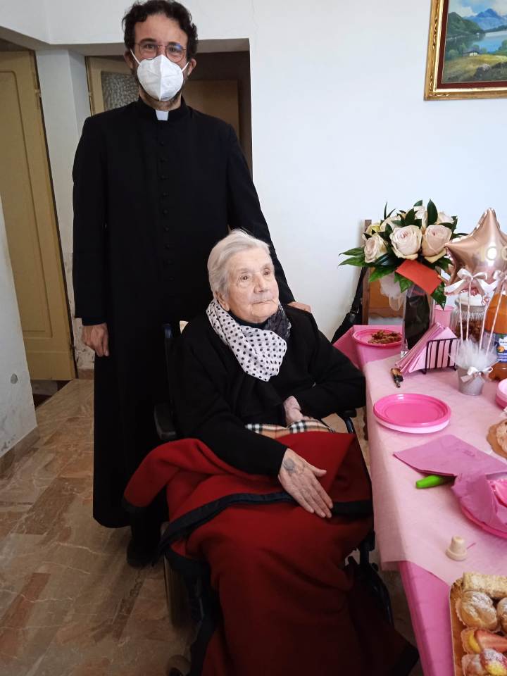 ACQUAVIVA PICENA – Gli auguri di buon compleanno alla neo centenaria di Acquaviva Picena, Eurosia Gaetani, sono giunti anche dal parroco don Pierluigi, dal sindaco Rosetti e dal vice sindaco Balletta. Il parroco don Pierluigi ha ricordato che alcuni anni fa era già stato a casa di Eurosia, quando c’era ancora il caro fratello don Elio. Poi insieme alla festeggiata hanno pregato. Eurosia ha ricevuto l’Eucarestia e il Sacramento degli Infermi. Il sindaco ha detto: “Un bellissimo giorno per la nostra Eurosia Gaetani, raggiungere cento anni significa festeggiare una lunga storia nella storia. A nome dell’Amministrazione Comunale e di tutta la comunità acquavivana, rivolgiamo i più calorosi auguri di buon compleanno ad Eurosia”. Eurosia è una donna conosciuta ad Acquaviva, perché la sua famiglia possedeva l’unico forno del paese ed è rimasto tale per tantissimi anni. La sua famiglia era composta dal papà Pacifico, dalla mamma Elvira, dalle sorelle Olga, Pia, Maria e dal fratello don Elio; Eurosia è stata ed è tutt’ora una donna di grande fede e discreta, ma sempre pronta ad accogliere e a dialogare. Una donna laboriosa, da bambina aiutava la famiglia nel forno e ha continuato ad occuparsi della sua famiglia fino ad arrivare, finché le forze gliel’hanno permesso, ad accudire il fratello don Elio. Ora trascorre le sue giornate pregando, telefonando alla sorella Maria e circondata dall’affetto delle nipoti Gabriella, Maristella e Altea e della signora che si occupa di lei.