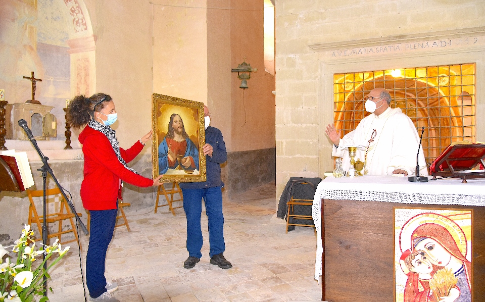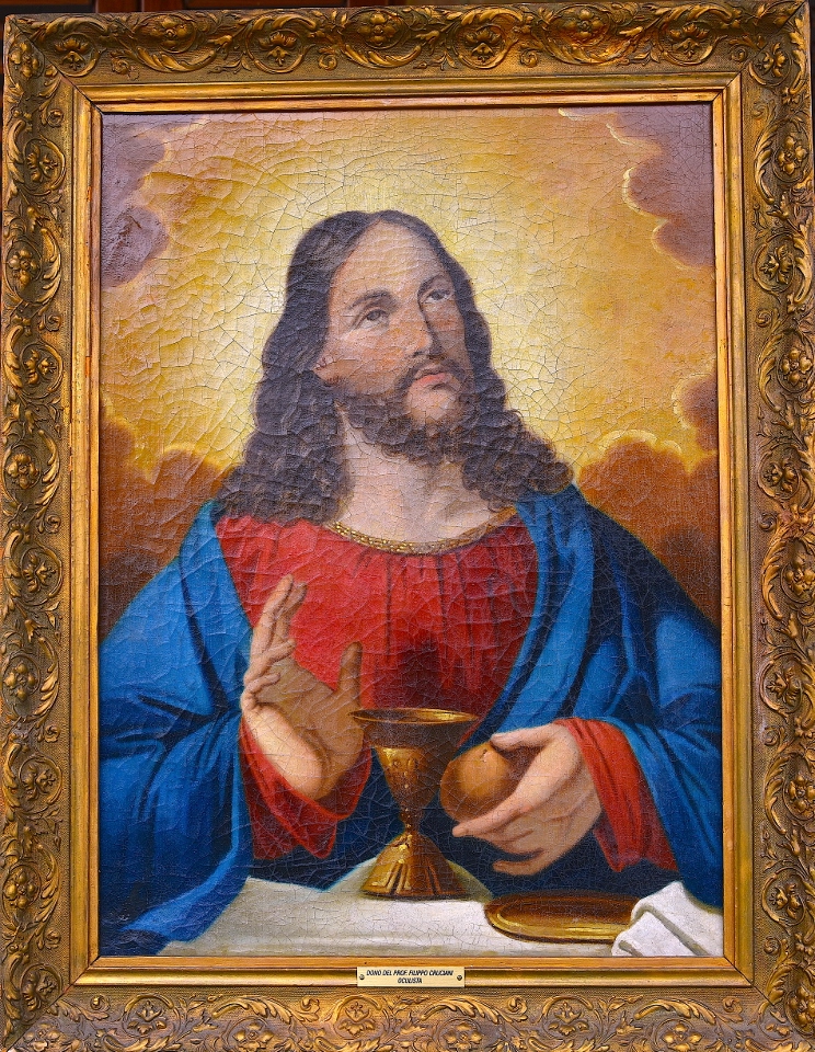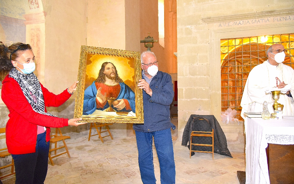 Egli, che nelle occasioni in cui ritorna al suo paese nativo risiede proprio in questa Contrada (e quindi “contradaiolo” anche lui!), ha portato in dono al Santuario, e alla comunità tutta, un bellissimo e prezioso quadro del ‘700-‘800 raffigurante “Gesù Eucarestia” delle dimensioni di cm 50×70!