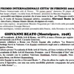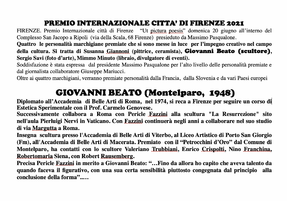 Giovanni Beato-scultore montelparese, unitamente ad altre tre personalità marchigiane (Susanna Giannoni-pittrice e ceramista, Sergio Savi-foto d’arte, Mimmo Minuto-libraio e divulgatore di eventi),  ha ricevuto il premio alla carriera  per essersi “messo in luce, nella sua intensa vita artistica, per l’impegno creativo nel campo della cultura dando lustro e merito a tutto ciò che la cultura rappresenta nel mondo, in tutte le sue molteplici manifestazioni, dall’ arte, alla letteratura, all’impegno sociale”.