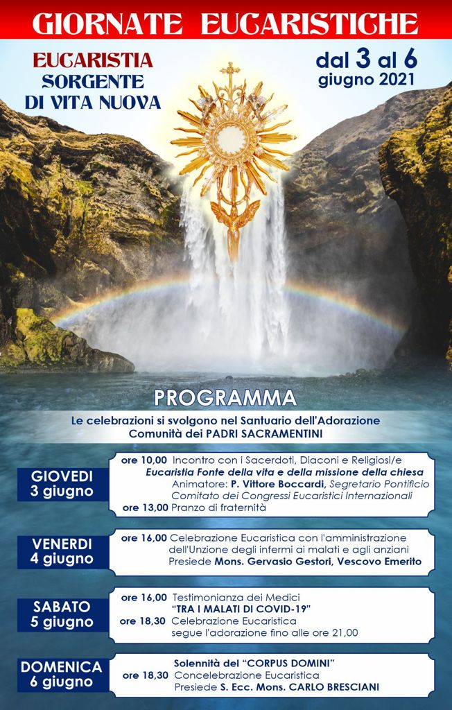 Le giornate eucaristiche si concluderanno domenica 6 giugno alle 18.30, Solennità del Corpus Domini, con la celebrazione eucaristica presieduta da Mons. Carlo Bresciani.
