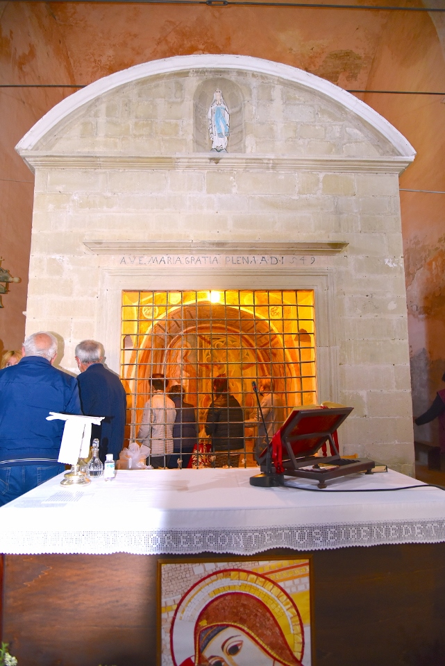 Dopo la preghiera, e prima di tornare ognuno nelle proprie case, i fedeli hanno voluto attraversare, con devozione e raccoglimento rivolgendo un’ultima e personale preghiera alla Madonna, l’interno della preziosa Cappellina del Santuario!