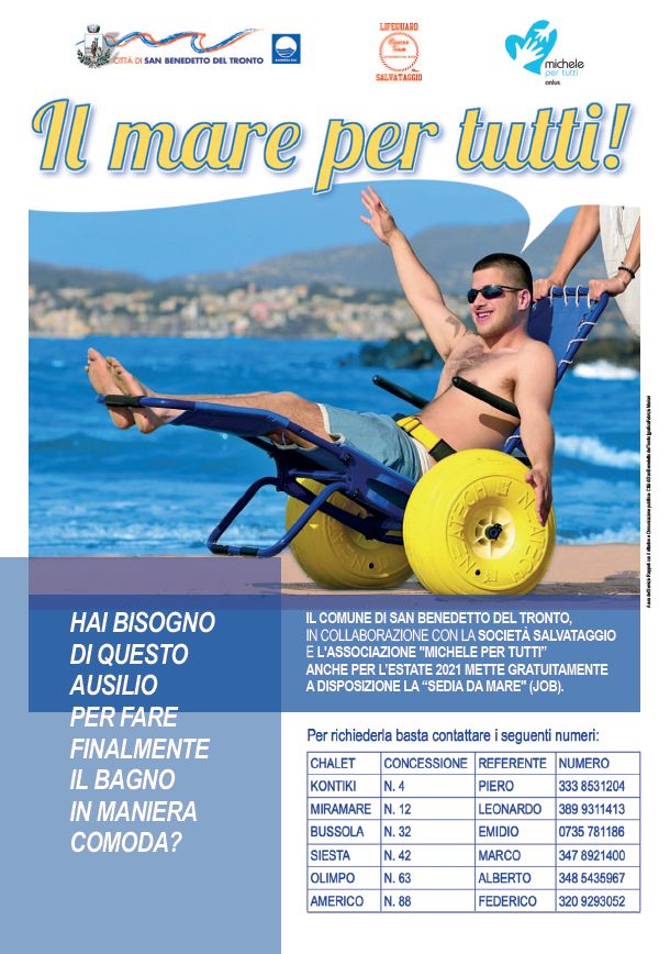 L’utilizzo delle sedie “JOB” verrà garantito gratuitamente a tutti quelli che ne avranno bisogno per muoversi in libertà in spiaggia, per fare un bagno, perché si è momentaneamente impossibilitati a deambulare. Il Comune, con la collaborazione della Società Salvataggio e dell’Associazione “Michele per Tutti”, metterà a disposizione diverse sedie. Per richiederle basterà rivolgersi ai seguenti stabilimenti balneari: