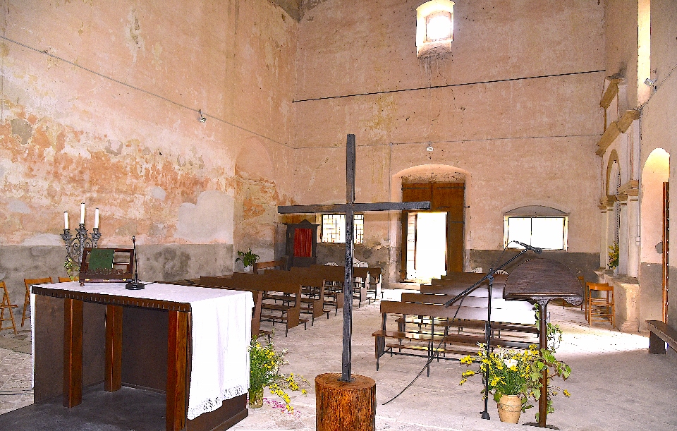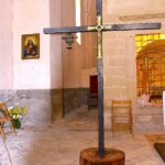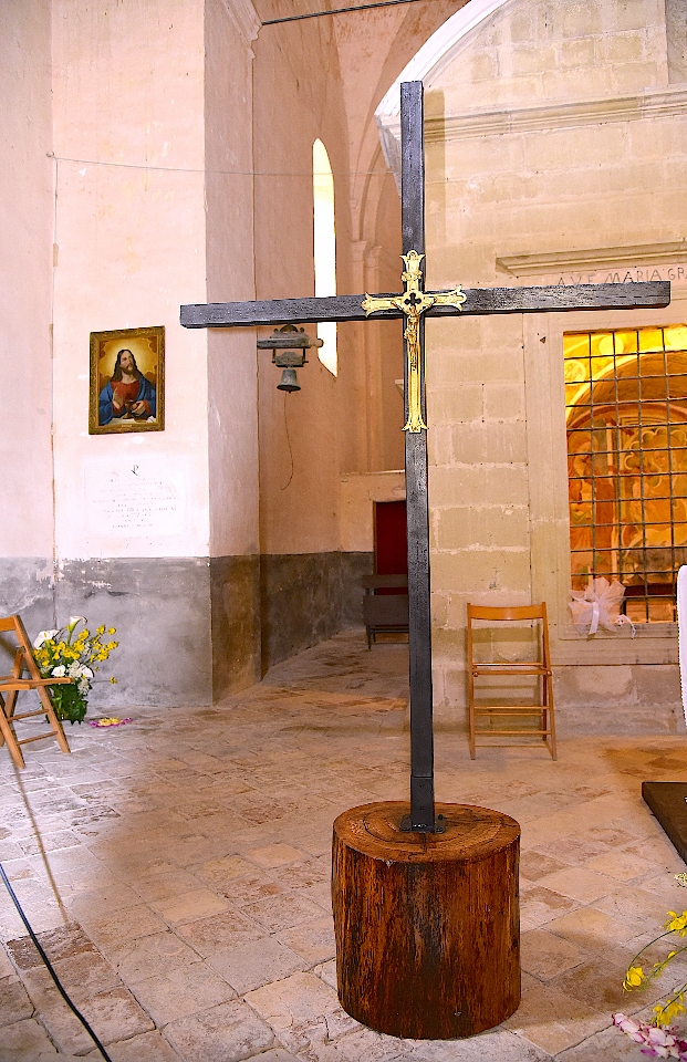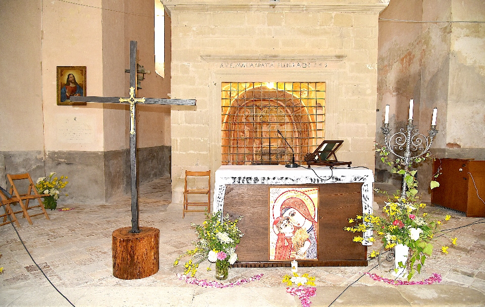 Per l’occasione l’altare del Santuario si arricchiva di un grande e prezioso Crocifisso ligneo al centro del quale era stato incastonato un antico “Cristo in Croce” in ottone! Lo stesso è stato poggiato al di sopra di un pesante tronco di quercia appositamente e dignitosamente preparato a riceverlo! Il Crocefisso è stato donato dall’Associazione Culturale “Il Murello” di Montelparo e il lavoro di preparazione, per poterlo degnamente posizionare al fianco dell’altare, è stato eseguito con grande amore e dedizione da tre “contradaioli”: Paolo, Pierino e Giuseppe.