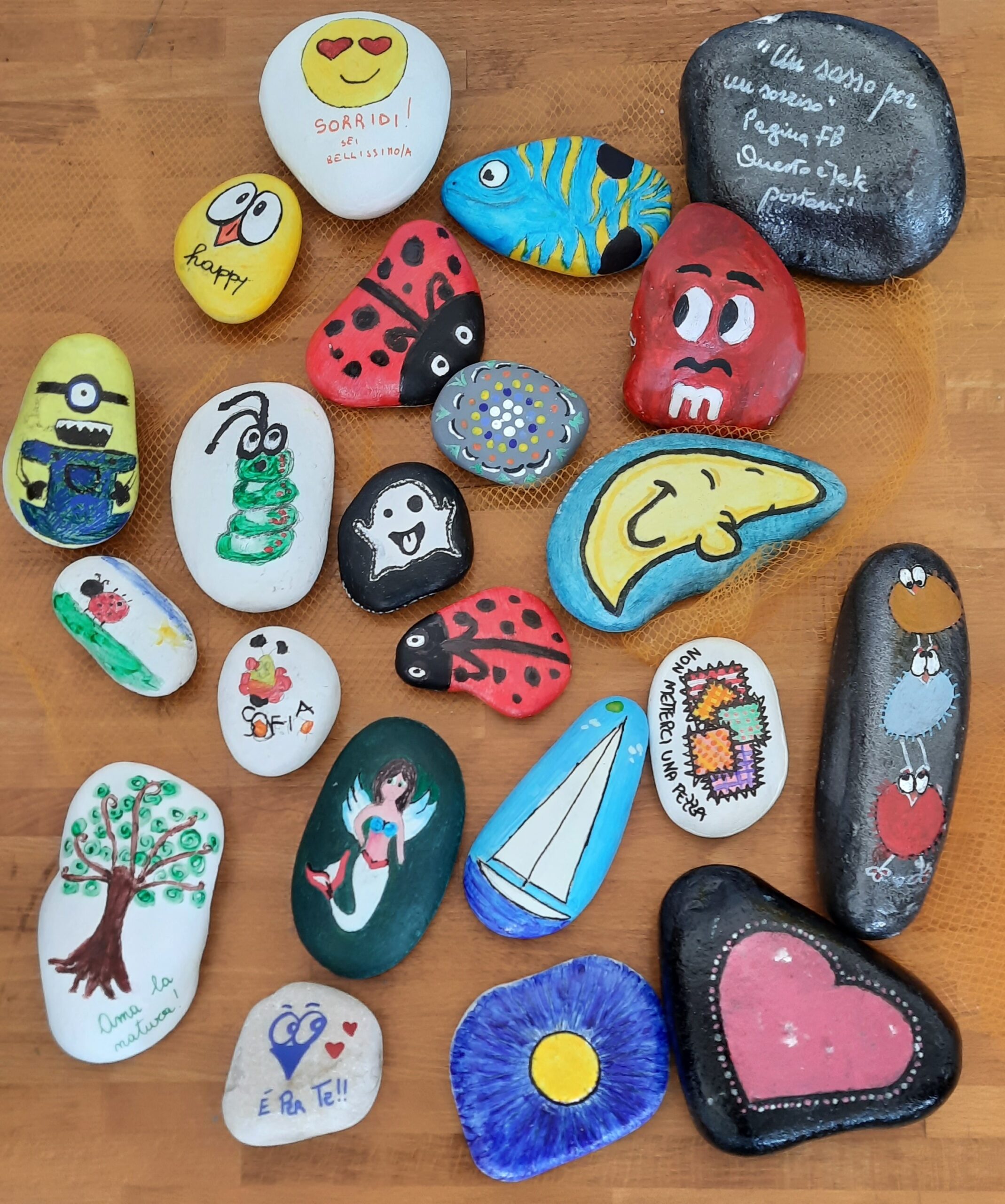 Si tratta di dipingere o disegnare sassi e rilasciarli negli angoli (non troppo nascosti) della città perché siano trovati da qualcuno e poi ripostati sul gruppo facebook ‘Un sasso per un sorriso’ (Originale).