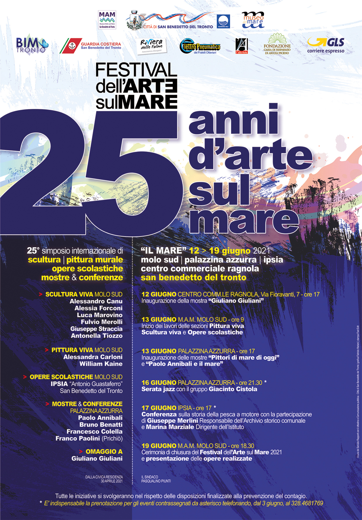 Il Festival, che avrà come titolo “Venticinque anni d’arte sul mare” e come tema “il mare”, in onore della storia della nostra citta`, si svolgera` dal 12 al 19 giugno e conterra` le sezioni “Scultura Viva”, “Pittura Viva”, “Opere scolastiche” e “Mostre & Conferenze”.
