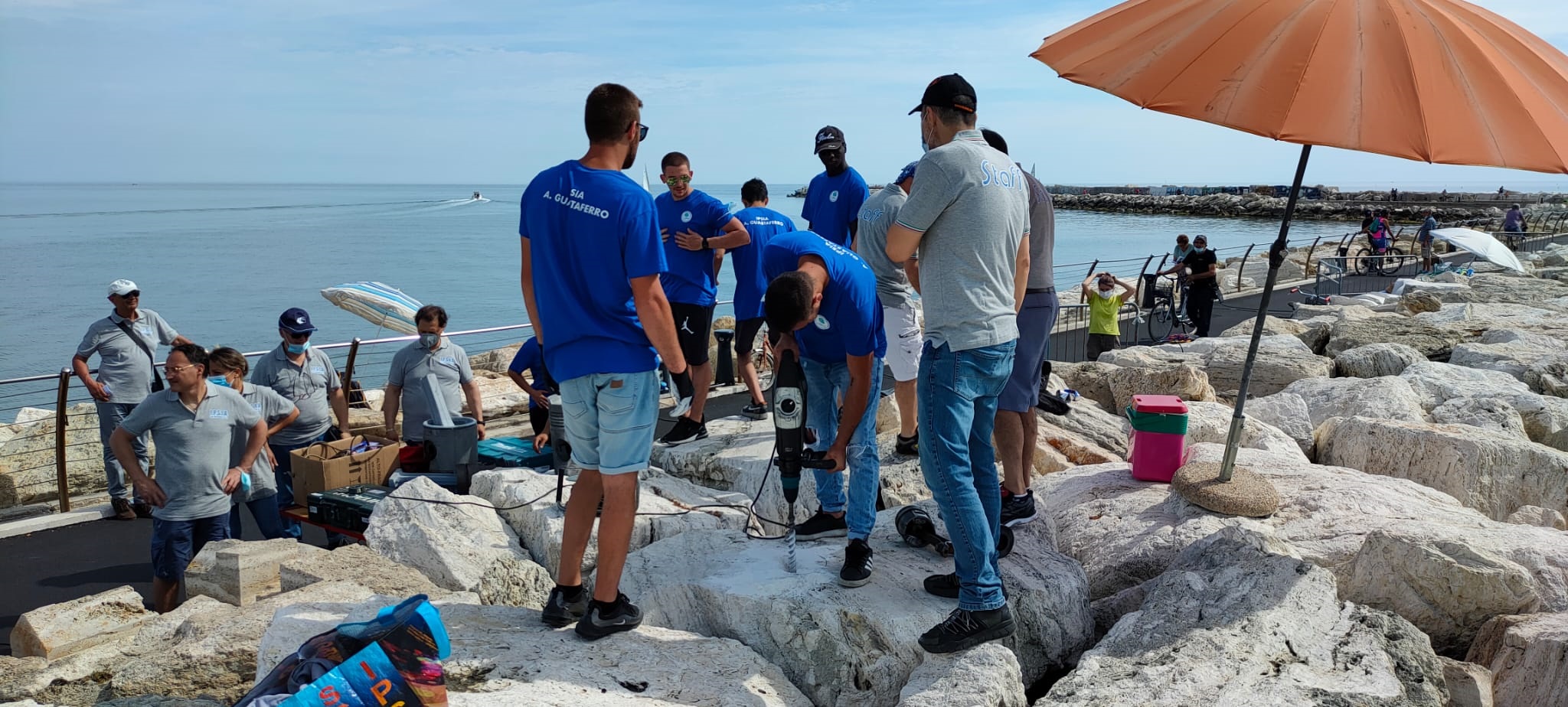 L’IPSIA Guastaferro raddoppia: per la sezione opere scolastiche domenica 13 giugno studenti e docenti hanno realizzato al Molo Sud un’istallazione che vuole rendere omaggio alla marineria sambenedettese, unendo virtualmente i meccanici navali portuali a quelli 4.0 di oggi. L’opera ha previsto l’utilizzo di tre pistoni di diverso alesaggio di motori navali uniti alle bielle e collocati su un masso a simboleggiare la famiglia marinara.