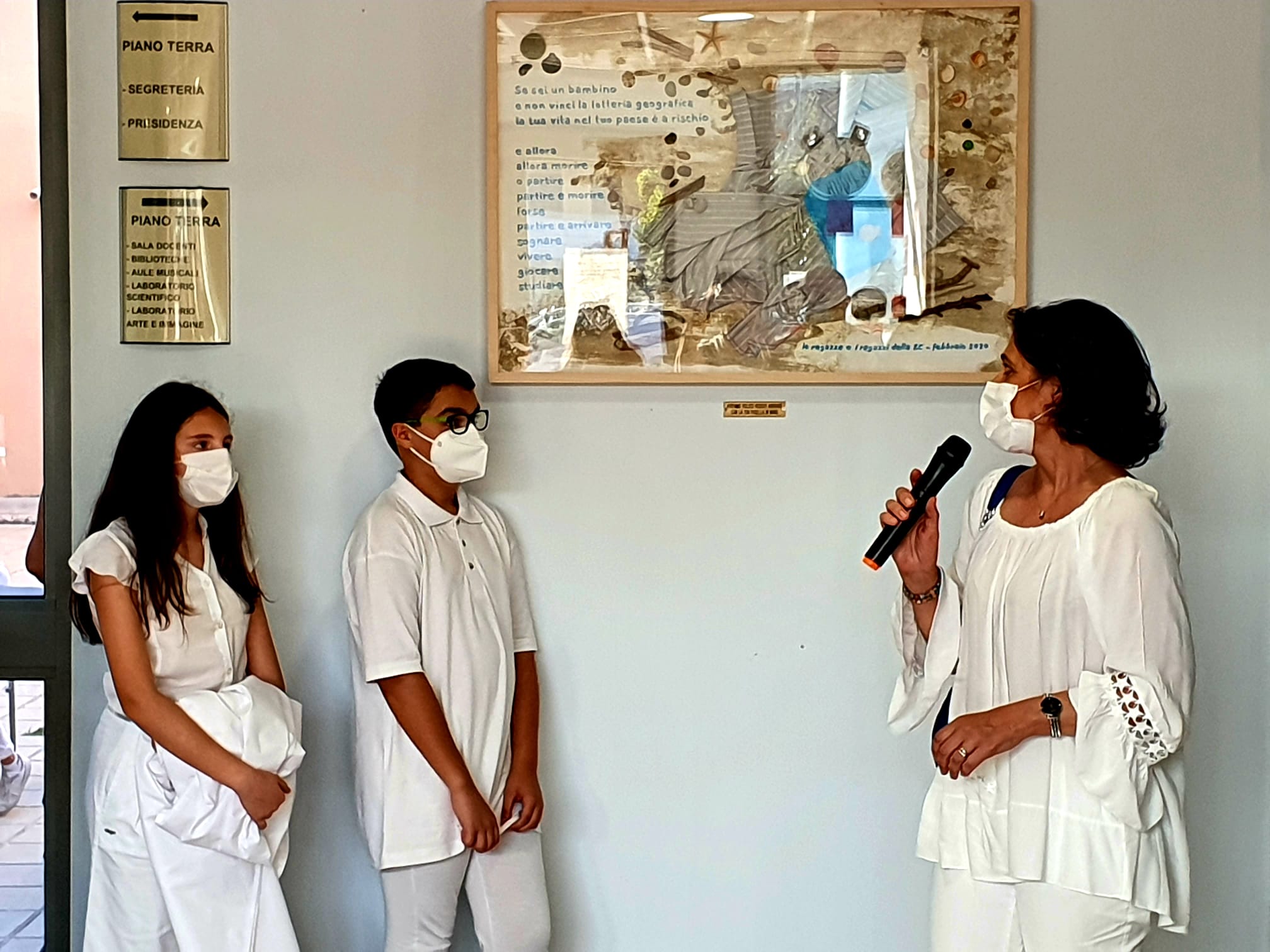 SAN BENEDETTO DEL TRONTO – “Qui aspettavamo il giovane del Mali morto annegato il 18 aprile 2015 portando una pagella sul cuore. Ogni insegnante giusto lo avrebbe accolto”. E’ la scritta incisa sulla pietra d’inciampo incastonata all’ingresso della scuola media Curzi di San Benedetto, inaugurata nel corso di una cerimonia alla presenza del sindaco di San Benedetto del Tronto, Pasqualino Piunti e della dirigente dell’Isc Centro Laura D’Ignazi, assieme a docenti e ragazzi dell’orchestra dell’indirizzo musicale che hanno eseguito una serie di brani. Un’iniziativa dedicata alla storia del ragazzo africano annegato in mare con una pagella cucita all’interno della camicia, per il quale è stata scoperta anche un’installazione artistica che rimarrà nell’atrio dell’istituto. L’opera è stata realizzata dalla professoressa Catia Cichetti assieme ai ragazzi della classe 3C. Una teca con all’interno una camicia e una pagella, assieme a conchiglie e sabbia e la scritta “Se sei un bambino e non vinci la lotteria geografica la tua vita nel tuo paese è a rischio. E allora… allora, morire o partire, partire e morire, forse partire e arrivare, sognare, vivere, giocare, studiare”. La vicenda del giovane maliano è stata portata sullo schermo dal cortometraggio “Fiori dal deserto”, realizzato dai ragazzi assieme agli insegnanti Riccardo Massacci, Catia Cichetti e Vincenza Marchegiani che è stato premiato al Romics, il Festival Internazionale di Roma del Fumetto, Animazione, Cinema e Games.