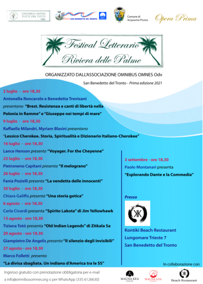 SAN BENEDETTO DEL TRONTO – Grande curiosità e aspettativa per il nuovo Festival Letterario che verrà ospitato a San Benedetto del Tronto: partirà il 2 luglio la I edizione del Festival Letterario Riviera delle Palme organizzato dall’Associazione Omnibus Omnes. Il calendario, che ha una scaletta di appuntamenti settimanali fino ad ottobre, avrà tra gli ospiti sia validissimi e noti autori sambenedettesi come ad esempio Antonella Roncarolo e Benedetta Trevisani, sia autori di calibro internazionale come Lance Henson poeta Cheyenne tra i maggiori autori Nativi Americani. Raffaella Milandri presidente della Omnibus Omnes ci svela i retroscena del Festival e la sua struttura: “È uno spazio culturale a trecentosessanta gradi, ma dedicato in particolare a tematiche storiche, sociali ed etiche, con pubblicazioni di alto livello contenutistico che abbiamo selezionato con attenzione tra gli autori della nostra costa adriatica. Nelle nostre serate ci saranno ben quattro prime nazionali. Abbiamo mantenuto un’impostazione coerente con le tematiche universali trattate dalla nostra Associazione e quindi all’interno del Festival avremo anche le premiazioni dei Concorsi sugli Obiettivi Sostenibili ONU e spazio alle “culture altre”, in particolare ai Nativi Americani. Il 30 luglio avremo anche la prima presentazione della vincitrice del Concorso Opera Prima Chiara Galiffa. Non potrà mancare un momento dedicato a Dante Alighieri che celebra i suoi settecento anni: un prezioso saggio divulgativo di Paolo Montanari. Finalmente possiamo organizzare eventi in presenza”. Giampietro De Angelis, vice presidente della Omnibus Omnes, ha aggiunto: “La prima edizione abbraccia, pur prediligendo tematiche culturali, storiche e sociali, anche altri tipi di pubblicazioni, ma stiamo lavorando già con lo sguardo la 2022. Il progetto sarà orientato alla letteratura etica, che non è letteratura di nicchia, abbracciando molte realtà”. La location strategica del Festival nei mesi estivi sarà lo Chalet Kontiki, sul lungomare di San Benedetto del Tronto, con ampi spazi sia all’aperto che al coperto, facilmente raggiungibile. Si raccomanda di prenotare per garantirsi il posto a sedere nel rispetto delle normative anticovid: basta scrivere a info@omnibusomnes.org., oppure mandare un messaggio whatsapp al seguente numero: 3356126630 con nome e cognome dei partecipanti.