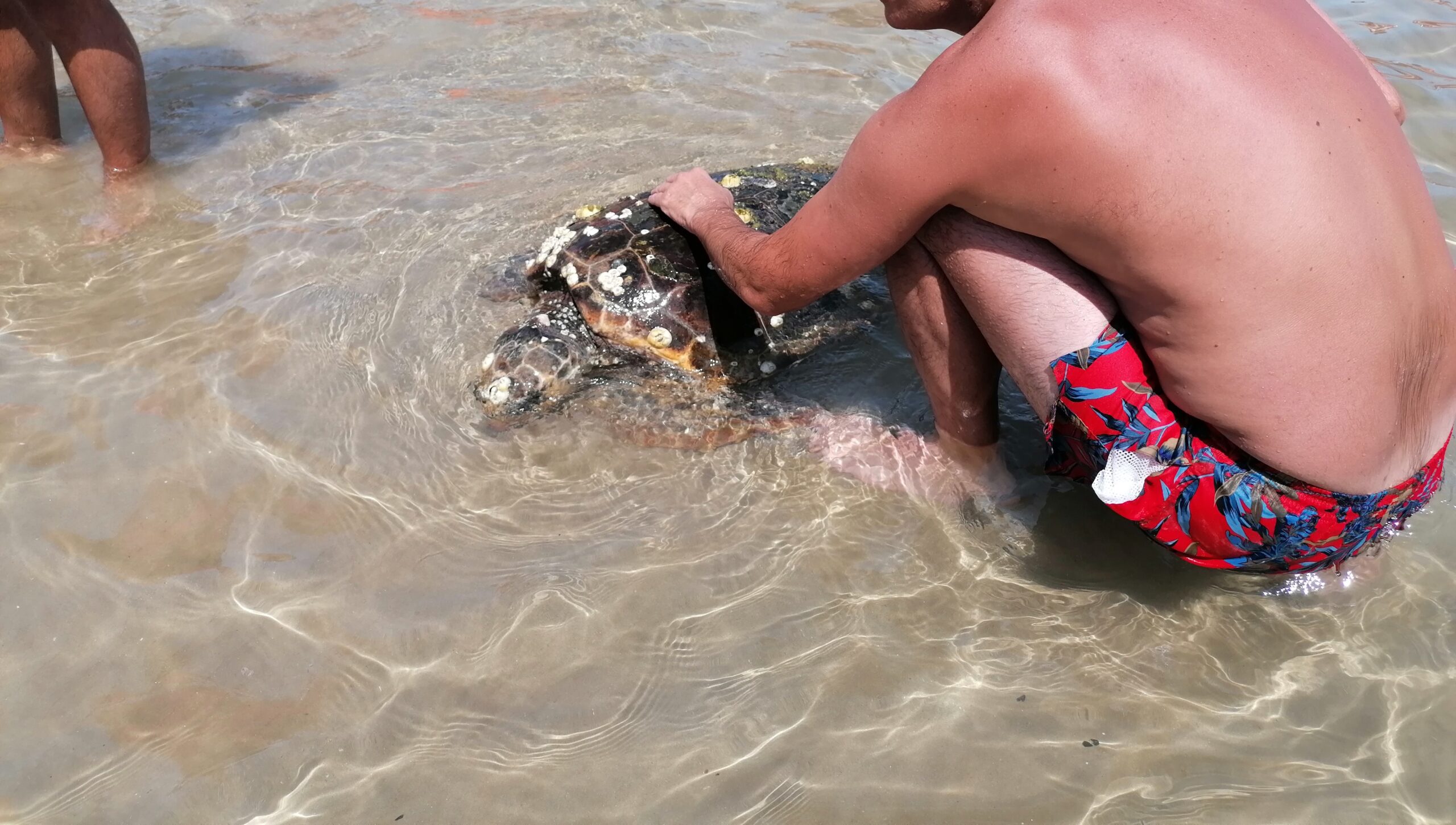 Chiamata la Capitaneria di Porto ed attivato l’iter per la salvaguardia e tutela di animali protetti, la tartaruga è stata spruzzata continuamente nell’acqua bassa per mantenerne l’idratazione, in attesa dei soccorsi. Il carapace appariva coperto di muschi e conchiglie, sembrava quasi una vecchissima piccola isola galleggiante. Ogni tanto il rettile provava ad addentrarsi nell’acqua più profonda, ma nuotava in “pendenza” come se il suo corpo pesasse più da una sola parte. Evidentemente era spaventata dalla folla a cerchio che pur corretta e su indicazioni dei bagnini, si teneva alla larga dell’animale per non infastidirlo. Due militari della capitaneria di porto vigilavano sulla riva e l’attesa era regolata da più bagnini.
