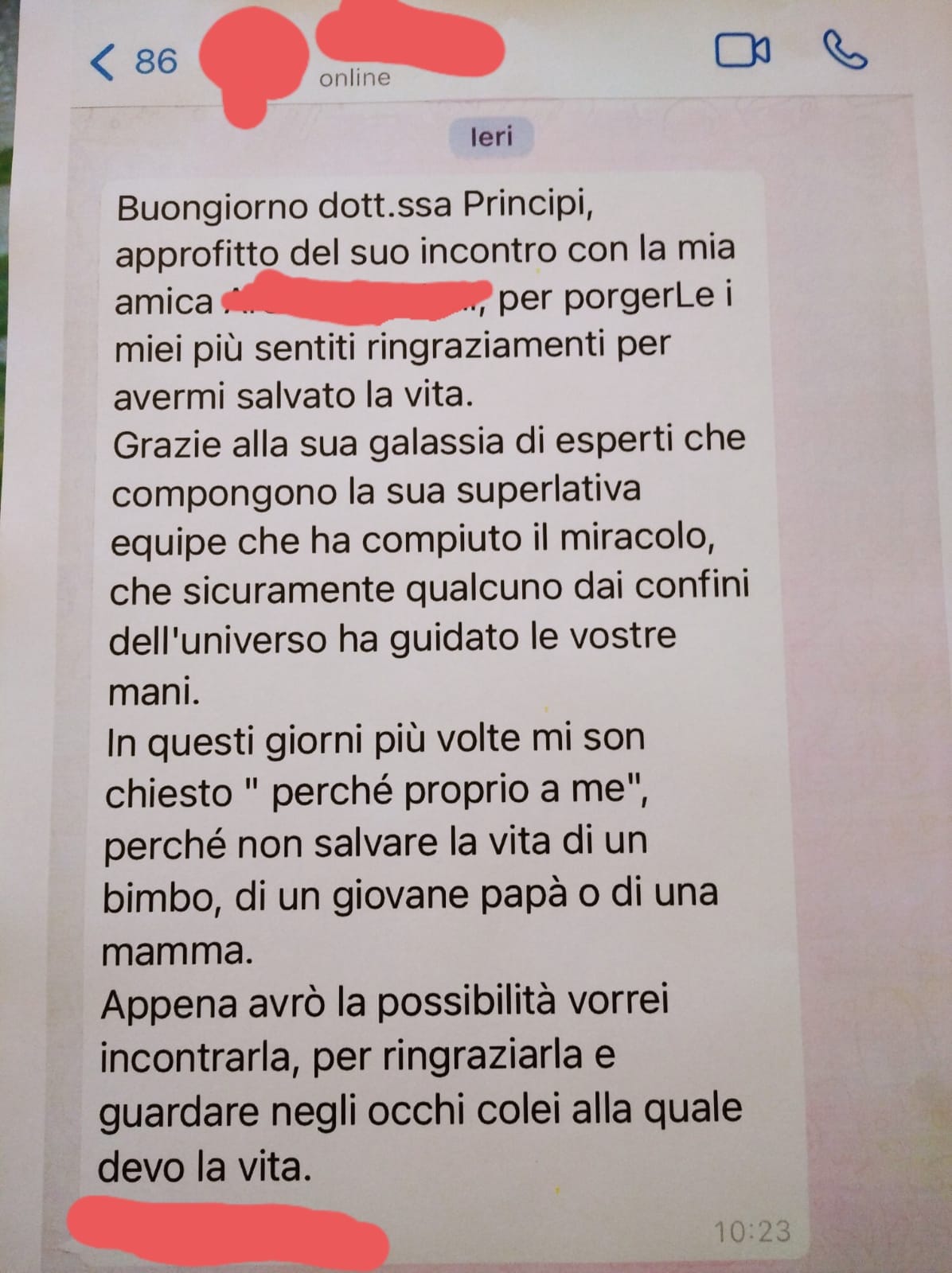 Purtroppo la pandemia è ancora in corso e faccio difficoltà a trovare qualcosa di positivo in questa esperienza. Nella Fase 1 della pandemia siamo stati supportati dalla popolazione e trattai come eroi; ora, invece, si pretende tutto. Purtroppo noi sappiamo ancora poco di questo virus, quindi abbiamo ancora poche armi e siamo comunque sempre molto soli. A volte sembra che il problema sia solo di chi sta in Pronto Soccorso, in Pneumologia o in Medicina d’Urgenza e Rianimazione, perché molto colleghi e specialmente delle specialità chirurgiche, non sempre capiscono. Io stessa sono stata attaccata perché curavo i pazienti Covid. Se proprio devo pensare a qualcosa di positivo, mi viene in mente il più bel regalo che ho ricevuto in questi mesi, cioè questo messaggio che mi è stato inviato da un mio ex paziente: