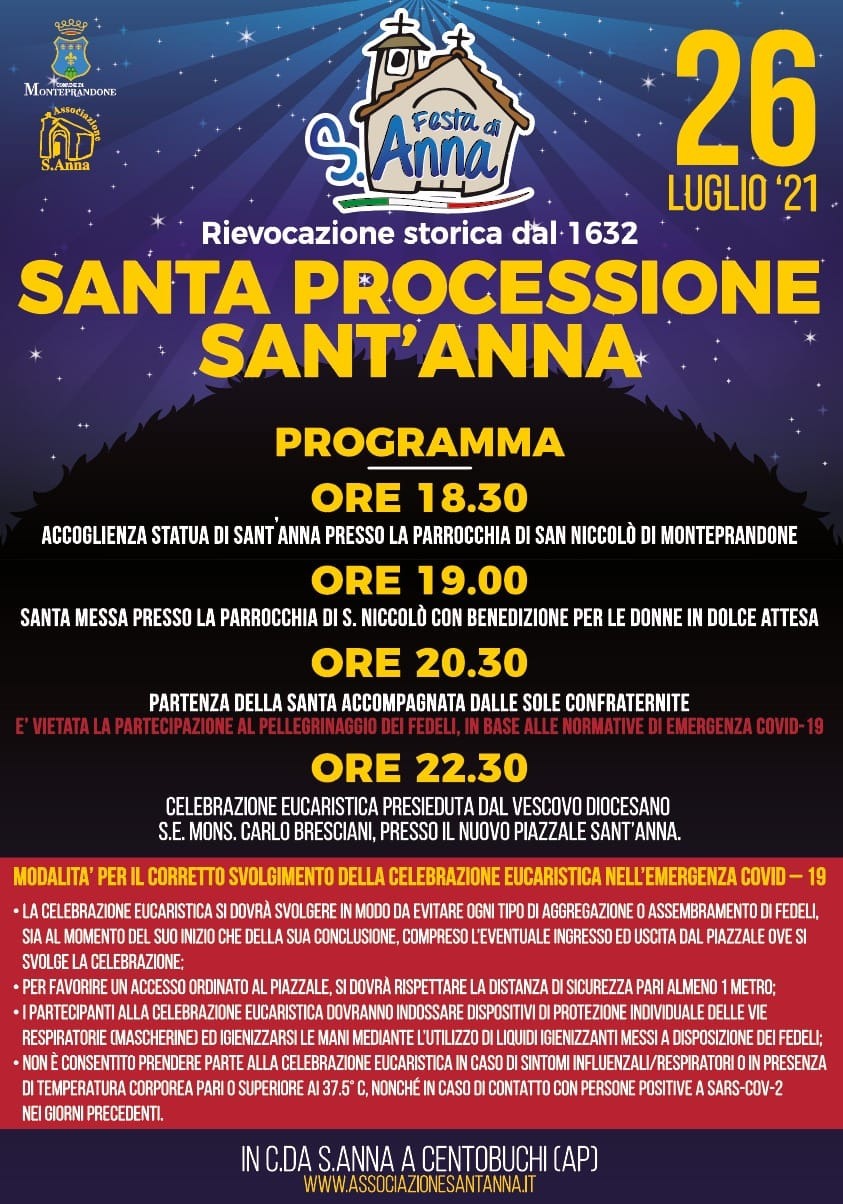 I festeggiamenti termineranno oggi, lunedì 26 luglio, alle ore 22.30 con la celebrazione eucaristica presieduta dal Vescovo Carlo Bresciani presso il Piazzale Sant’Anna.