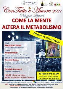 SAN BENEDETTO DEL TRONTO – Continuano gli incontri promossi dal Comune di San Benedetto del Tronto presso la Palazzina Azzurra, questa volta il tema sarà: “Come la mente altera il metabolismo”. L’incontro è previsto per giovedì 29 luglio alle ore 21:00 e vedrà la partecipazione del dott. Attilio Cavezzi, chirurgo vascolare e Pres. Ass. Nutrage. Saranno presenti il sindaco di San Benedetto del Tronto Pasqualino Piunti, l’assessore alle Pari Opportunità Antonella Baiocchi, il Consigliere Comunale Brunilde Crescenzi . Alle ore 22:30 musica alla Palazzina con Aldo D’Aponte: “Come una volta”.