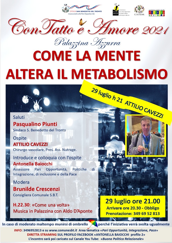 SAN BENEDETTO DEL TRONTO – Continuano gli incontri promossi dal Comune di San Benedetto del Tronto presso la Palazzina Azzurra, questa volta il tema sarà: “Come la mente altera il metabolismo”. L’incontro è previsto per giovedì 29 luglio alle ore 21:00 e vedrà la partecipazione del dott. Attilio Cavezzi, chirurgo vascolare e Pres. Ass. Nutrage. Saranno presenti il sindaco di San Benedetto del Tronto Pasqualino Piunti, l’assessore alle Pari Opportunità Antonella Baiocchi, il Consigliere Comunale Brunilde Crescenzi . Alle ore 22:30 musica alla Palazzina con Aldo D’Aponte: “Come una volta”.