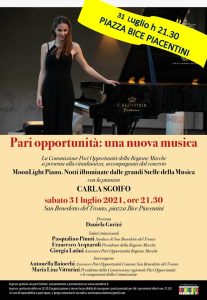 SAN BENEDETTO DEL TRONTO – La Commissione Pari Opportunità della Regione Marche si presenta ai cittadini con un incontro in piazza Bice Piacentini a San Benedetto del Tronto con la partecipazione della pianista Carla Sgoifo, sabato 31 luglio alle ore 21:30. L’ingresso è gratuito con posti limitati, obbligo di prenotazione su: wwweventbrite.it; l’ingresso allo spettacolo partirà alle ore 20:30, l’organizzazione si riserva la possibilità di riassegnare i posti prenotati a chi si presenterà oltre le ore 21:20.