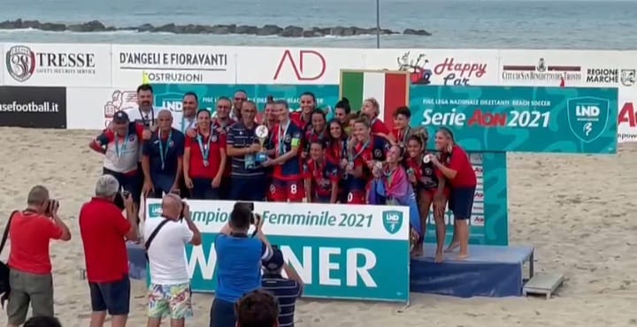 Monica: Nel 2019 non ci aspettavamo di partecipare, figuriamoci di vincere! Invece, per lo scorso anno, un pensierino ce lo avevamo fatto, ma poi la pandemia ha impedito lo svolgimento del campionato 2020. Quest’anno la voglia di ricominciare ad avere una vita normale ed il fatto che comunque il nostro è uno sport che si gioca all’aperto, hanno fatto sì che potessimo partecipare e vincere. Le quattro arene scelte dalla FIGC ad inizio campionato sono state Napoli, Locri, Lignano Sabbiadoro e la nostra San Benedetto del Tronto. Le squadre che hanno partecipato al campionato femminile sono state sette in tutta Italia, quindi sono stati organizzati due gironi, poi la prima di ciascun girone ha giocato la finale che quest’anno si è disputata proprio in casa nostra, a San Benedetto del Tronto, dove abbiamo affrontato il Napoli, vincendo 2 – 1.