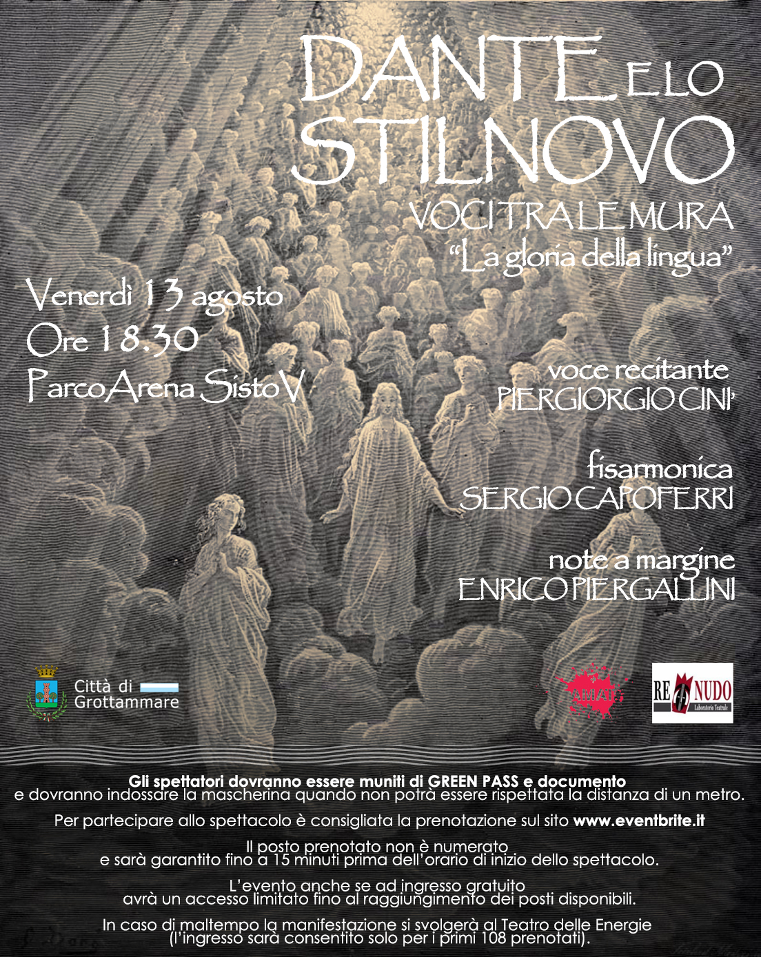 In scena, l’attore Piergiorgio Cinì (voce recitante) e il musicista Sergio Capoferri (fisarmonica), per un altro omaggio dedicato al VII centenario della morte del sommo poeta da parte della Città di Grottammare. Introduzione storica e curiosità letterarie a cura di Enrico Piergallini.