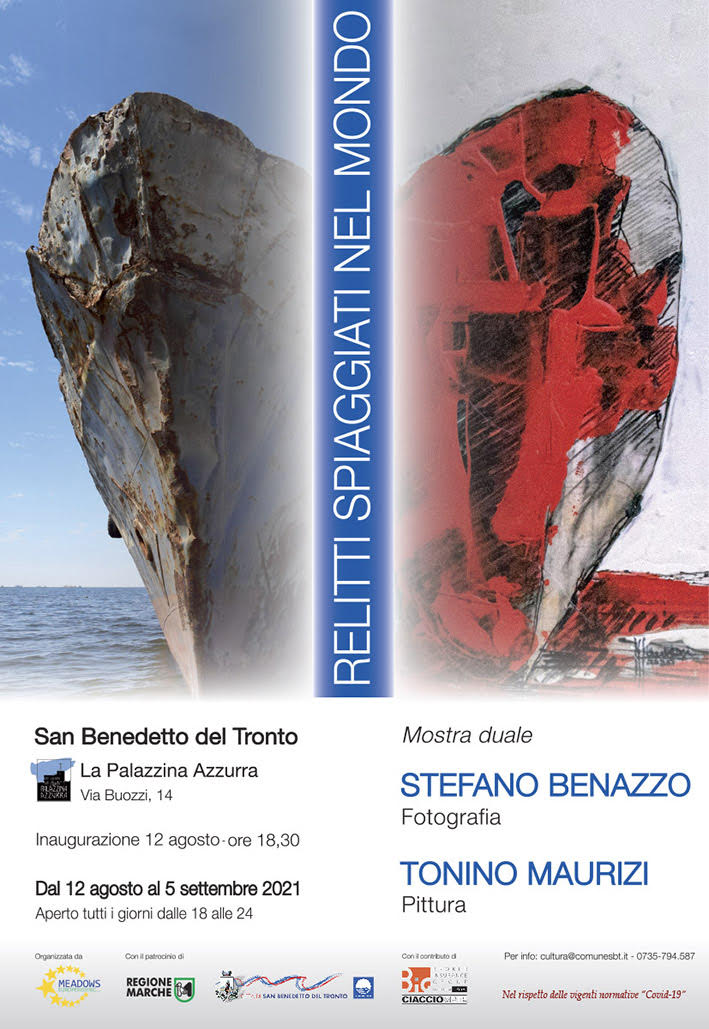 Il pittore, scultore, designer montecosarese Tonino Maurizi torna ad esporre in una mostra con il fotografo Stefano Benazzo dal titolo “Relitti spiaggiati nel mondo” che si apre alla Palazzina Azzurra di San Benedetto del Tronto giovedì 12 agosto (inaugurazione alle 18,30) per rimanervi fino al 5 settembre (tutti i giorni dalle 18 alle 24). L’esposizione ha il patrocinio della Regione Marche e del Comune di San Benedetto del Tronto.