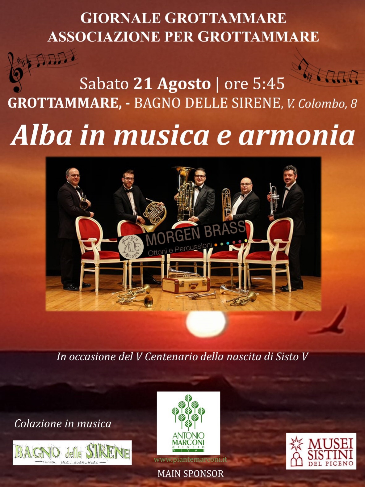 Simone Incicco, direttore del giornale Grottammare, dichiara: “L’evento nasce per condividere insieme ai Grottammaresi e ai turisti un altro momento di bellezza, donato da quanti si sono adoperati con gratuità per renderlo possibile. Abbiamo cercato di sostenere il mondo della cultura, chiamando una band di ottoni radicata sul territorio, ma molto conosciuta anche all’estero, i “Morgan Brass”, affinché questa alba possa essere un nuovo inizio per la comunità di Grottammare. Un grande ringraziamento va a tutti i componenti dell’Associazione ‘Per Grottammare’, ai partner ‘Bagno delle Sirene’, ai ‘Musei Sistini’ e allo sponsor ‘Antonio Marconi Vivai’ che ha reso possibile l’iniziativa”.