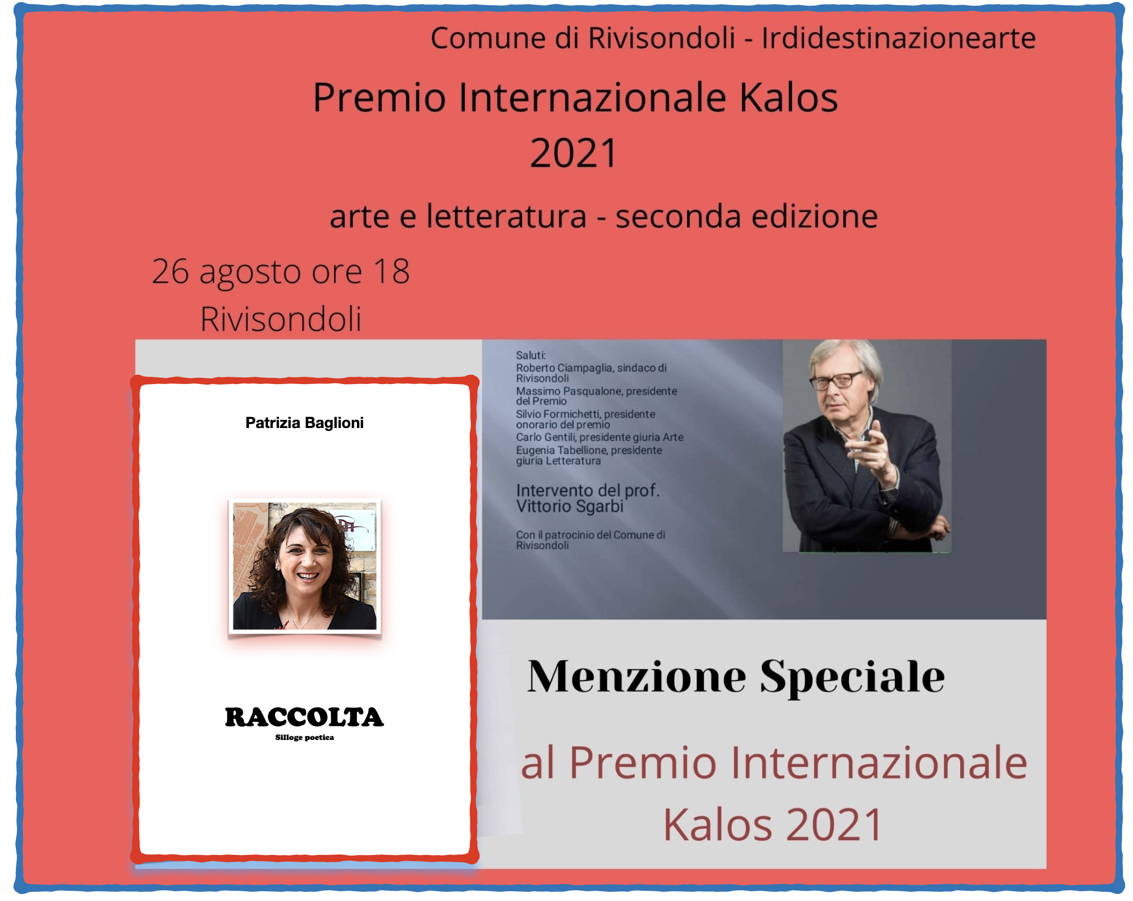 Dopo essersi vista attribuire il “Premio Internazionale Irdidestinazionearte per la comunicazione della cultura, dell’arte e della letteratura” (premio che le verrà consegnato a Penne, l’antica capitale del popolo dei Vestini, il giorno 28 agosto 2021) quale autrice di “Il colpevole è il koala” (La Ruota edizioni) un originale “giallo” poliziesco investigativo ambientato nelle Marche e “Woby – Storia di un’amicizia” con la casa editrice The Pink Factory Publishing, è notizia di ieri che la stessa Patrizia ha ricevuto una “Menzione Speciale” nell’ambito del “Premio Internazionale Kalos 2021, arte e letteratura” per la sezione “B” Poesia Inedita!