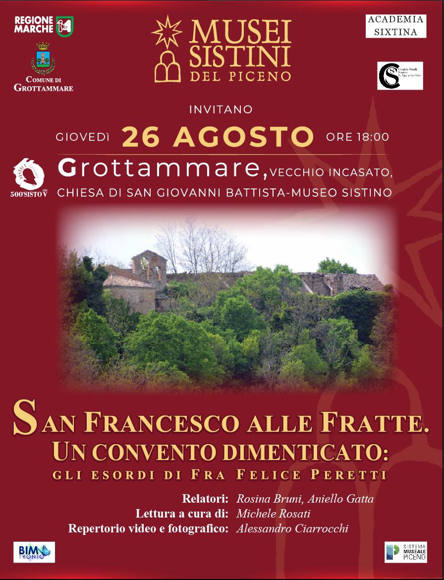 “L’evento rappresenta il penultimo degli incontri previsti dai Musei Sistini nell’ambito delle celebrazioni del V centenario della nascita del pontefice Sisto V previsti per l’estate 2021 – sottolinea la direttrice della rete museale Paola Di Girolami -. Non potevamo porre l’accento su questo convento e chiesa diruti anche come sprono a intervenire su questi due edifici, importanti dal punto di visita storico, artistico, architettonico e anche per ciò che rappresentano: cioè il luogo dove fra Felice Peretti si è introdotto alla sua vita spirituale. L’ubicazione di questo appuntamento al Museo sistino di Grottammare è legata alla presenza in questo luogo del Cristo di ambito spoletino proveniente proprio da San Francesco alle Fratte relazione all’interno”.