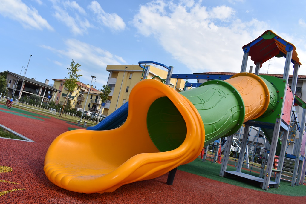 L’area è suddivisa in ambienti, dedicati alle quattro abilità motorie di base: area della manualità, della mobilità, dell’equilibrio e del gioco simbolico. Diverse le tipologie di gioco presenti: molle inclusive, altalene, bilico, giochi combinati con scivoli a tubo e aperti per i più grandi e un’area ludica a misura dei bimbi più piccoli.