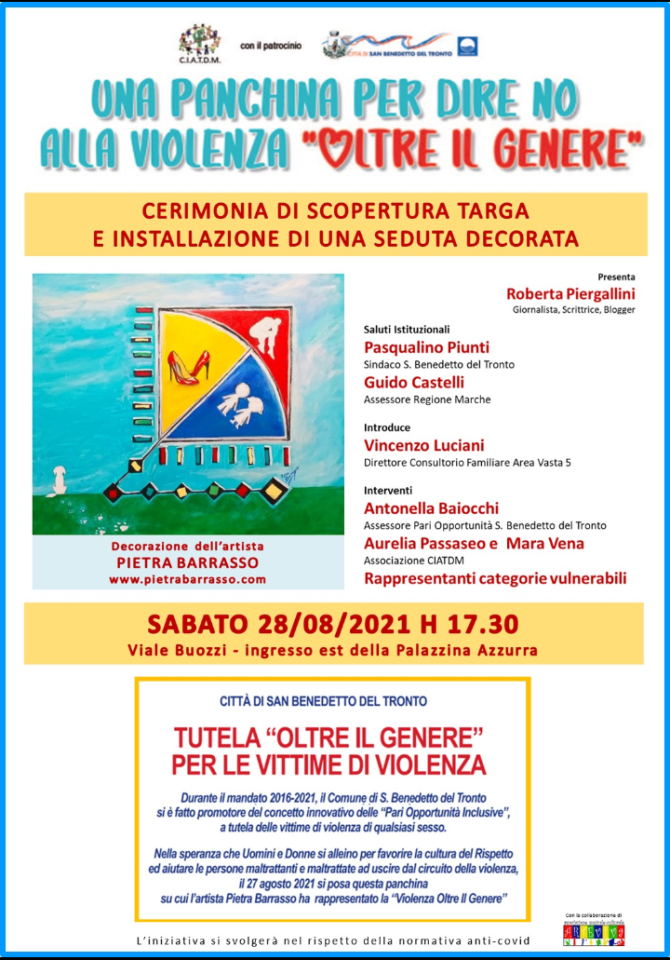 SAN BENEDETTO DEL TRONTO – Sabato 28 agosto alle ore 17:30 in Viale Buozzi, ingresso lato est della Palazzina Azzurra, ci sarà una cerimonia di scopertura della targa e di inaugurazione e installazione di una panchina decorata dall’artista Pietra Barrasso per simboleggiare il rifiuto della violenza di genere: “Una panchina per dire “no” alla violenza oltre il genere”. L’Assessore Baiocchi del Comune di San benedetto del Tronto da tanti anni ormai porta avanti una rivoluzione culturale in ambito della violenza affettiva. Secondo l’Assessore Baiocchi la violenza non colpisce solo le donne, ma anche minori e uomini, c’è quindi bisogno di impegnarsi attivamente per eliminare la violenza. L’evento si svolgerà all’aperto nel pieno rispetto delle norme anti covid.