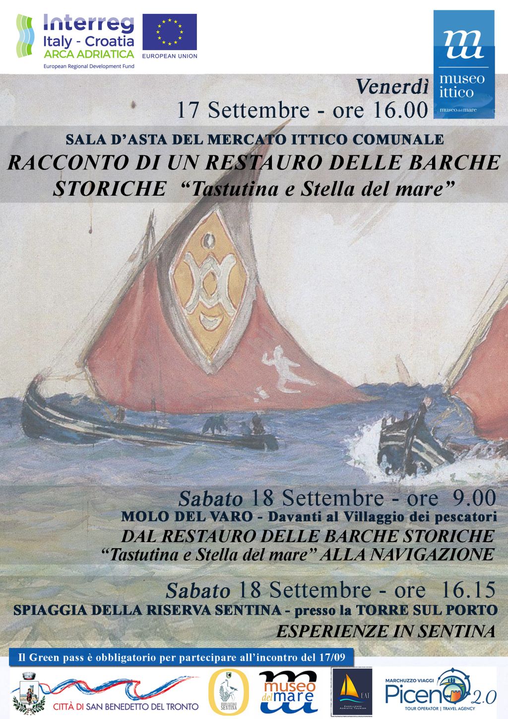 Si comincia venerdì 17 settembre alle 16 alla sala d’asta del mercato ittico all’ingrosso dove sarà presentato in un workshop il restauro di due barche storiche, “Tastutina” e “Stella del Mare”, cofinanziato proprio con i fondi di ARCA ADRIATICA. Interverranno tutti coloro che, a vario titolo, hanno contribuito al recupero delle due imbarcazioni e sarà proiettato un film che documenta le varie fase degli interventi di restauro. Per partecipare è obbligatorio esibire il “green pass”.