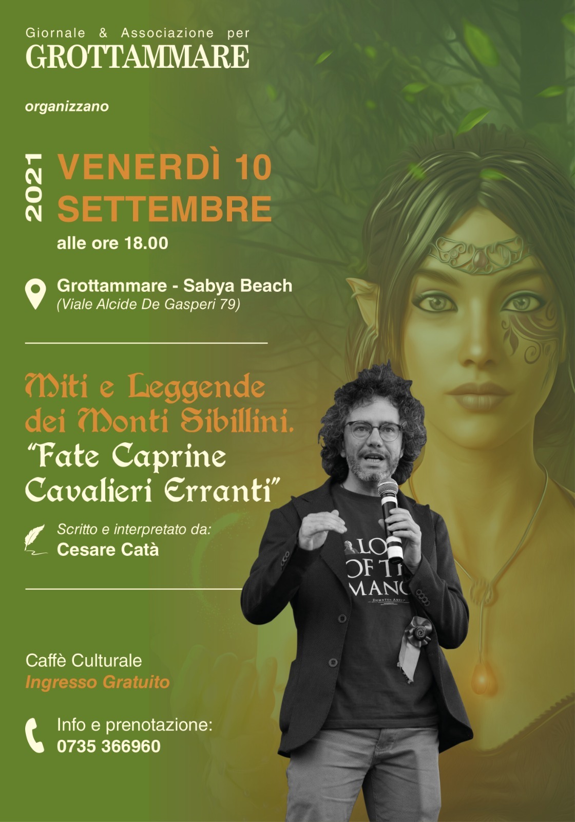 GROTTAMMARE – Venerdì 10 settembre alle ore 18.00, presso il Sabya Beach di Grottammare, si terrà un evento straordinario dal titolo “Miti e leggende dei monti Sibillini. Fate caprine, Cavalieri erranti”, un monologo scritto ed interpretato da Cesare Catà.