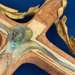 Dunque, siamo partiti con una semplice croce di legno, poi si sono aggiunte le decorazioni in cima con rami d’ulivo. Il dipinto con un risultato elegante per poi di nuovo scolpirlo e ri-dipinto. C’è stata l’aggiunta della foglia d’oro che ha trasportato il tutto nella dimensione spirituale. La croce scolpita in una intera tavola di castagno e stata posta attraverso un meccanismo di ferro su una base di travertino, la quale a sua volta e stata lavorata e modellata per assumere l’idea schematica della montagna del Golgotà.