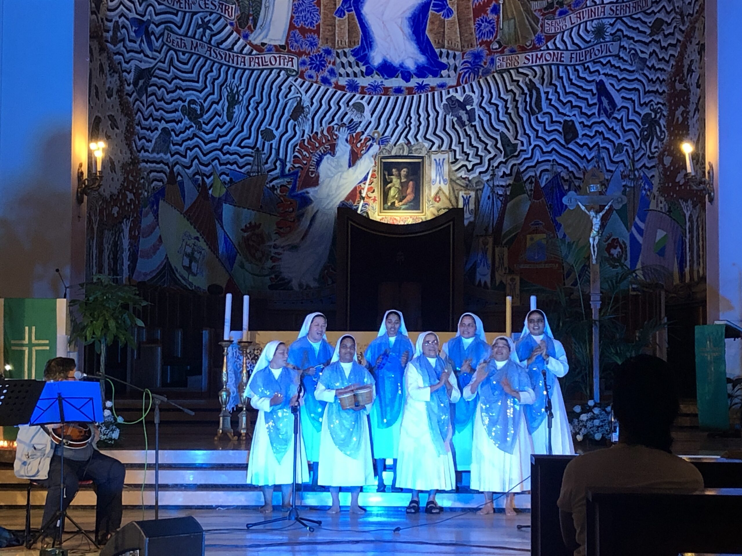 Diversi gruppi etnici hanno animato la serata con balli e canti. Ad aprire letteralmente le danze è stata una bambina indiana che insieme a sua sorella si è esibita in un ballo tradizionale. Dall’India provengono anche le suore del Piccolo Fiore di Betania, un ordine religioso presente nella nostra diocesi e che proprio quest’anno celebra il primo centenario dalla fondazione. Le religiose si sono esibite in una danza di preghiera, con un canto dedicato al fondatore e, infine, con un canto tradizionale indiano alla Madonna.
