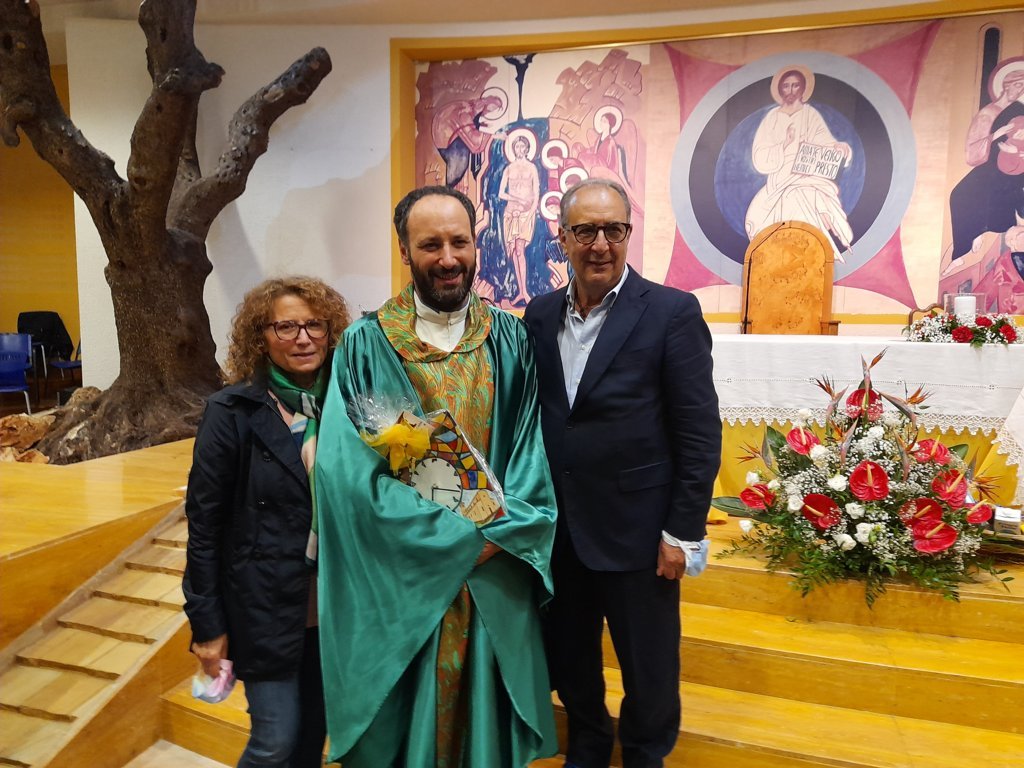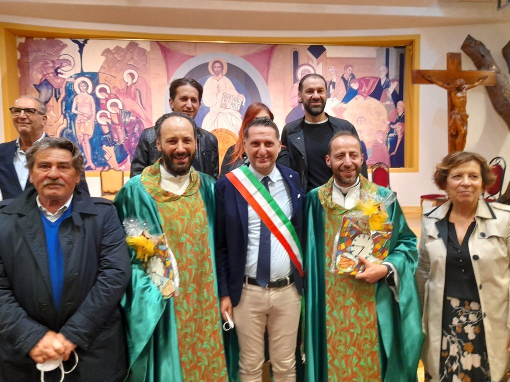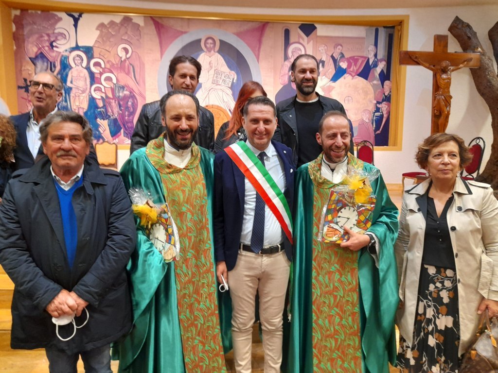 I Segretari Calvaresi e Straccia hanno poi omaggiato i due nuovi parroci di un orologio in ceramica con rappresentate le due Chiese di Regina Pacis e Sacro Cuore unite dallo Spirito Santo, proprio ad indicare da un lato l’unità delle due Parrocchie e dall’altro la voglia di scandire insieme questo nuovo tempo da vivere in comunione. Un orologio in ceramica è stato donato anche a don Gabriele, con l’auspicio che il tempo futuro sia per lui ricco di soddisfazioni pastorali.