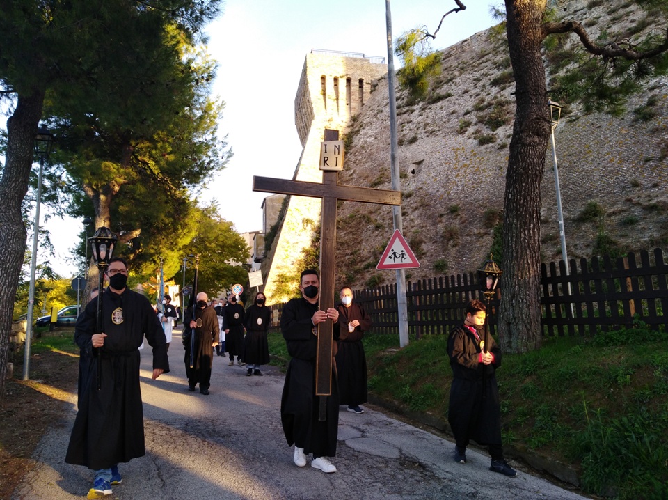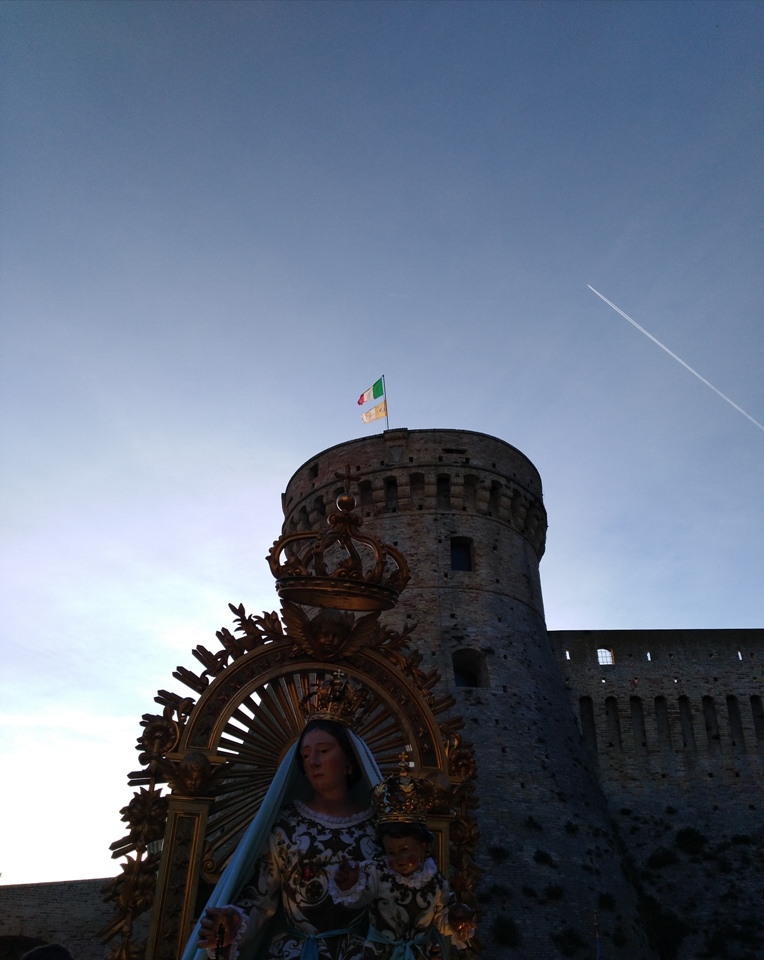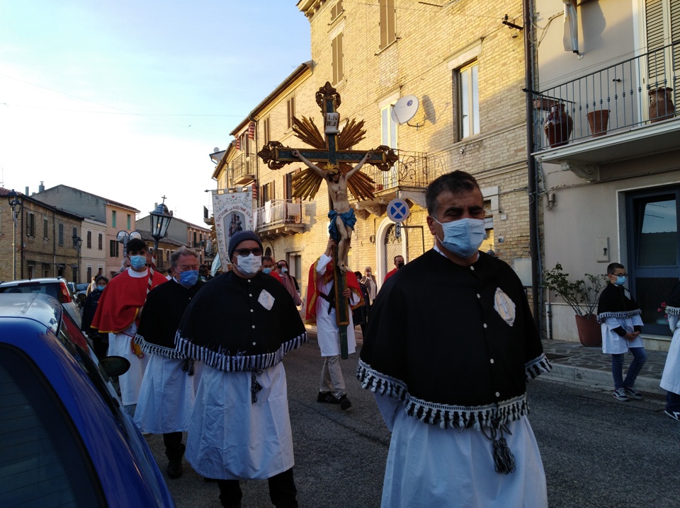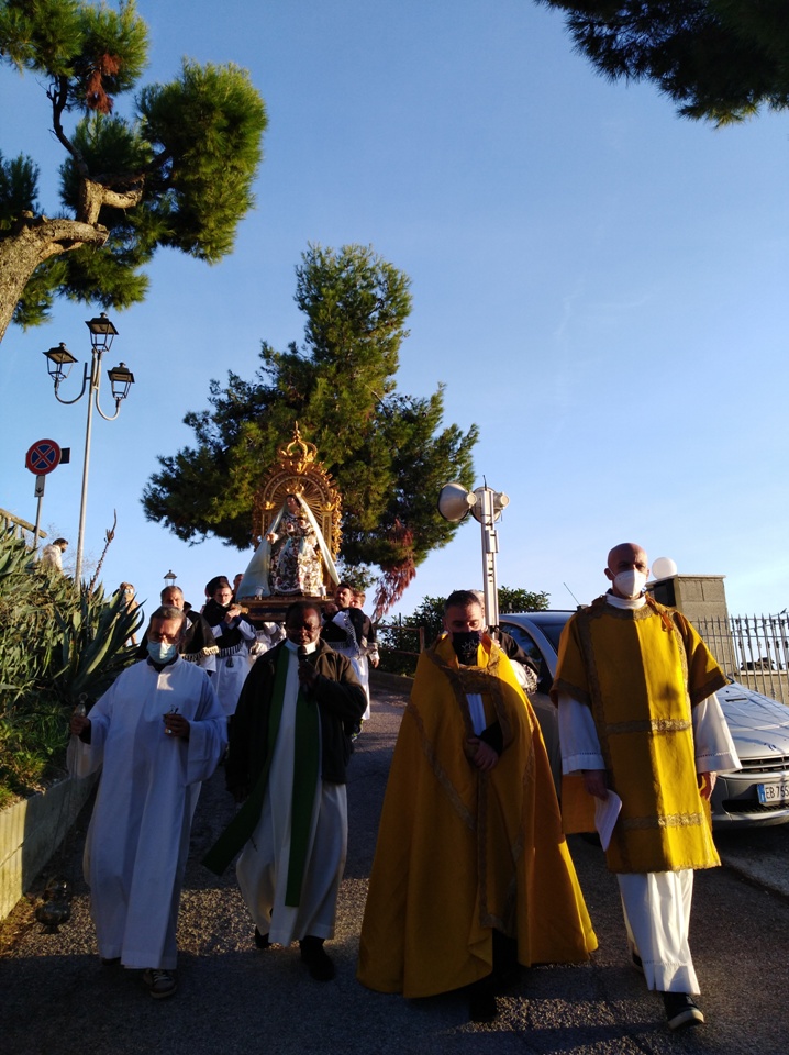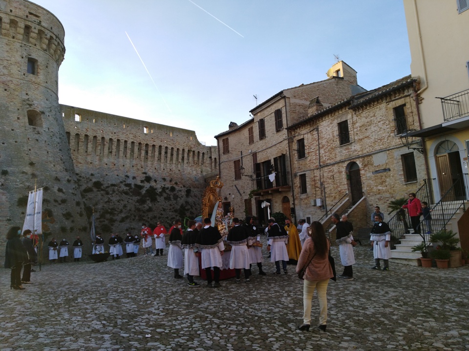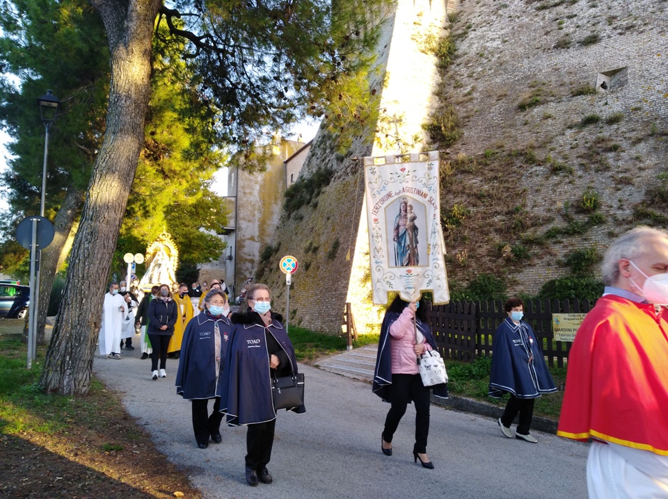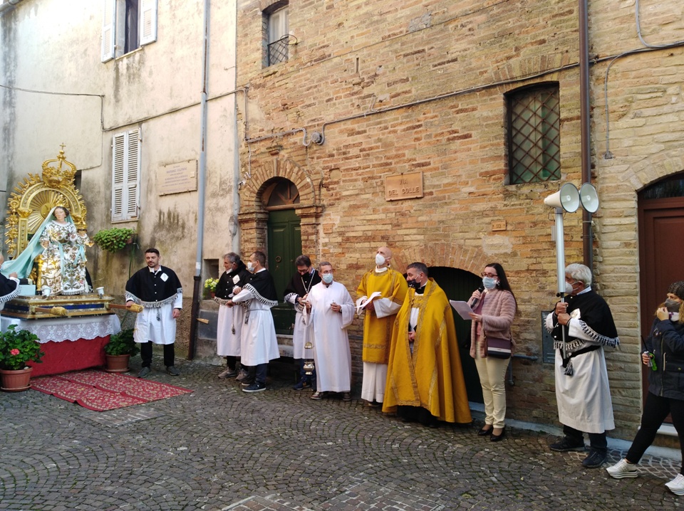 ACQUAVIVA PICENA – Domenica 24 ottobre la comunità di Acquaviva Picena ha onorato la Madonna del Rosario con una processione snodatasi per le vie del centro storico. Al termine della processione i fedeli hanno partecipato alla santa Messa celebrata dal parroco don Giuseppe Giudici con l’assistenza del diacono Giovanni. Nell’omelia don Giuseppe ha detto: “Sappiamo tutti che il Vangelo non è semplicemente la storia della vita di Gesù, la Parola è invece qualcosa di attuale che ha molto da dire alla nostra vita di tutti i giorni. Il miracolo non è al centro del brano del Vangelo che abbiamo ascoltato oggi, al centro c’è invece la luce della fede che Bartimeo ha ricevuto da Gesù. Dobbiamo riflettere sulla figura di questo uomo che passa dai bordi della strada dove mendica, al camminare lungo la strada dietro a Gesù. Gesù ci guarisce dalla nostra cecità, vince le nostre tenebre in modo che noi possiamo vedere in maniera più profonda dentro di noi e la realtà che ci circonda. La fede non è un insieme di comandamenti o cose da fare per mostrarci davanti a Dio, non è solo l’insieme di opere buone, la fede è anche guardare in maniera nuova noi stessi, gli altri e la realtà che ci circonda.