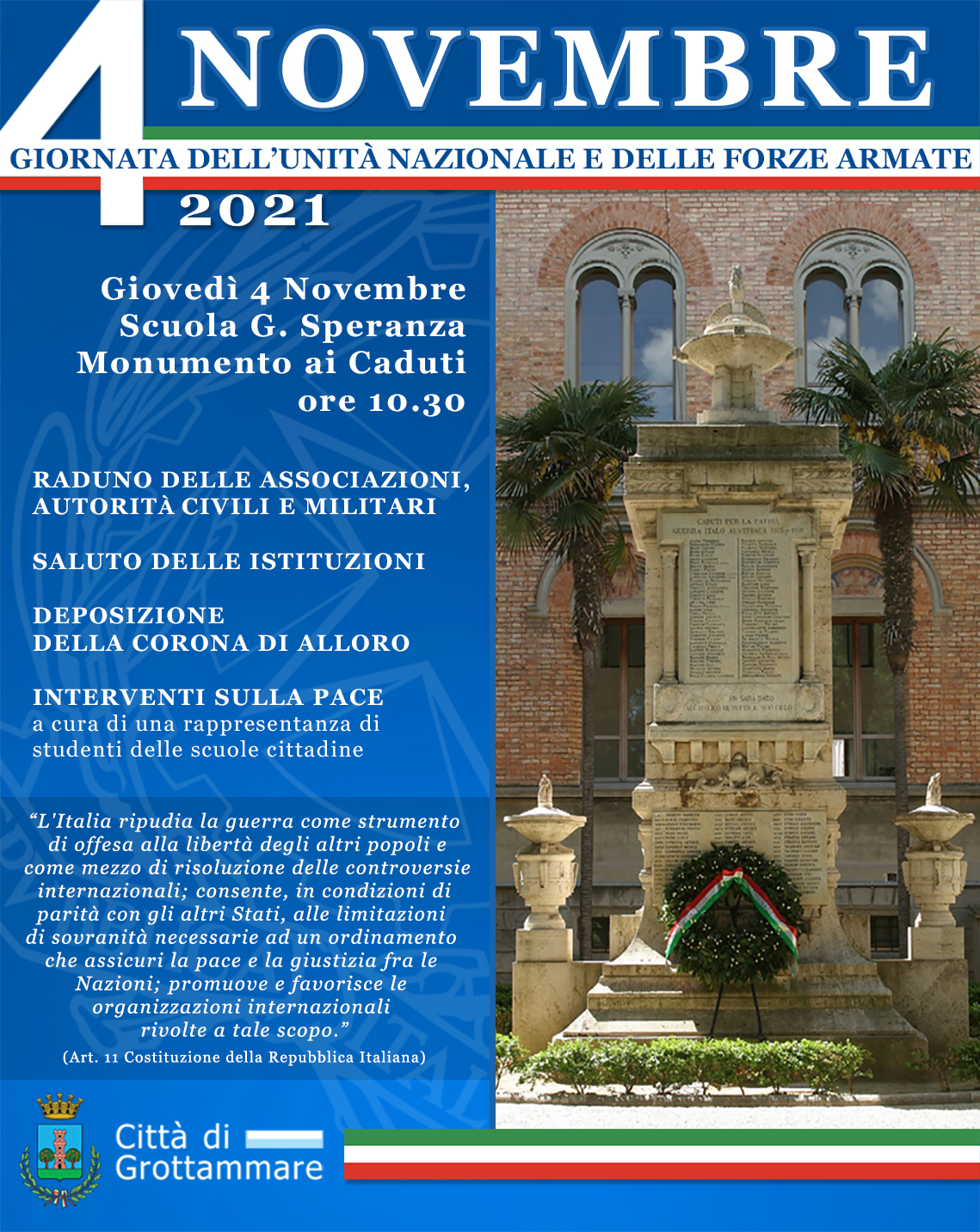 Onorare la festa del IV Novembre significa celebrare il coraggio e la dedizione delle tante persone che hanno pagato con la propria vita per costruire la democrazia e la libertà. Ispirati dall’art. 11 della Costituzione italiana, gli interventi e le riflessioni preparate dagli studenti chiuderanno la manifestazione.