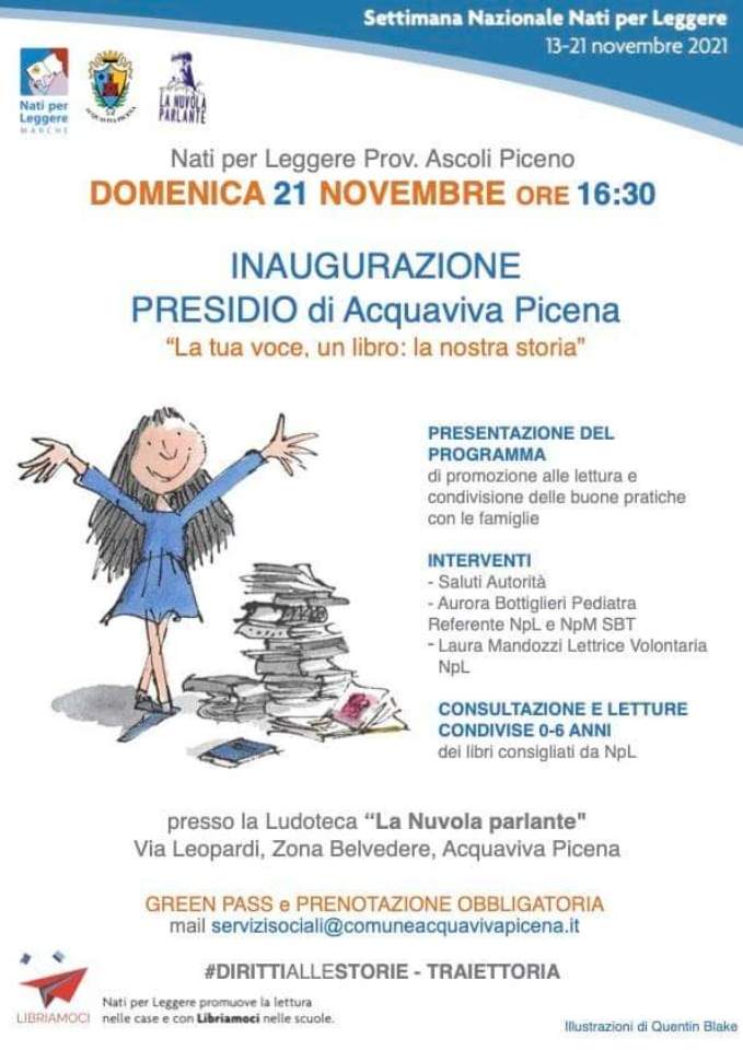 ACQUAVIVA PICENA – Presso la ludoteca “La nuvola parlante” di Acquaviva Picena, si svolgerà domenica 21 novembre alle ore 16:30 l’inaugurazione del presidio di “Nati per leggere”. L’inaugurazione di questo nuovo presidio è promossa dal Comune di Acquaviva Picena e “Nati per leggere” Marche. Il presidio è situato in via Leopardi, zona Belvedere ed è uno dei presenti della provincia di Ascoli Piceno insieme ad Offida e Appignano. L’Amm.ne Com.le di Acquaviva Picena è felice di inaugurare questo centro perché la lettura per i bambini in età prescolare con la presenza della propria famiglia, crea nel bambino uno sviluppo intellettivo, linguistico, emotivo e relazionale positivo e certamente migliore. Il servizio è affidato a delle volontarie che hanno ottenuto la certificazione in seguito al corso specifico, uno di esse è la referente Laura Mandozzi. L’inaugurazione sarà il 21 novembre, perché questa data rientra nella settimana nazionale di “Nati per leggere”, Settimana istituita nel 2014, la data è inoltre vicina al 20 novembre: Giornata Internazionale dei Diritti dell’Infanzia. “Nati per leggere” è un programma nazionale di promozione della lettura ai bambini con la presenza dei genitori, promosso dall’Associazione Culturale Pediatri, dall’Associazione Italiana Biblioteche e dal CSB Centro per la salute del bambino Onlus. Il programma è attivo su tutto il territorio nazionale con circa ottocento progetti locali che coinvolge più di duemila Comuni italiani. La lettura che prevede la presenza dei genitori crea, nel bambino che ascolta la voce del genitore, un legame con essi unico e uno sviluppo superiore; al bambino piace riascoltare la stessa storia perché ogni volta fa nascere in lui domande diverse, ma piace leggere anche storie diverse perché lo fanno viaggiare nella fantasia, la mente del bambino con la lettura viene stimolata, inoltre si addormenta prima e in modo sereno, migliorando anche la salute generale. Questo presidio rappresenta per Acquaviva Picena un traguardo importante ed è fiera di avere un luogo che possiede tutti i requisiti per offrire il servizio.