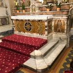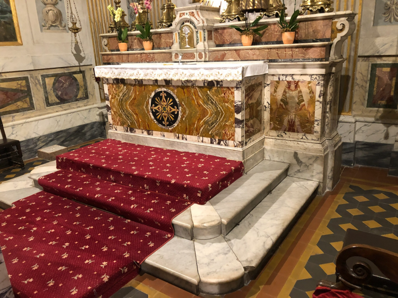 Passiamo ora al Martirio di San Matteo. Come è noto, nel dipinto si trova l’autoritratto – il terzo dopo quello del Bacchino Malato e l’altro presente ne I Musici – del Merisi. Generalmente si fa poco caso a quello che il Nostro indossa, ma il particolare è rilevante per l’argomento che stiamo trattando: Caravaggio porta sulle spalle un ferraiolo (fig. 4), proprio come quello che è al centro dei fatti dell’8 luglio 1597! A questo punto – anche se in questo caso non abbiamo alcuna prova documentale – l’anziano sull’estrema sinistra potrebbe essere il barbiere Marco Benni, il giovane che spalanca le braccia suo figlio Luca e il ragazzo di spalle il garzone Pietro Paolo Pellegrini, ovvero tutti personaggi che sono stati protagonisti o solo semplicemente menzionati durante il processo. Se la nostra interpretazione è corretta, Caravaggio ha legato la propria vicenda personale a quella che invece ha per soggetto l’apostolo Matteo. Ma non è finita qui. L’ambientazione nella quale si svolge la scena richiama in maniera piuttosto evidente un luogo che si trova praticamente attaccato all’Osteria della Lupa, ovvero la chiesa di San Nicola di Bari ai Prefetti. Se si entra nella chiesa non si può fare a meno di notare che l’altare è proprio quello raffigurato nel martirio di San Matteo. Nel nostro dipinto infatti l’altare è sopraelevato e posto in corrispondenza del terzo gradino, mentre San Matteo e il suo carnefice occupano lo spazio del primo gradino. Inoltre se osserviamo il paliotto possiamo scorgere una croce, anche se di carattere più semplice rispetto a quella reale dell’altare di San Nicola (fig. 5).