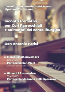 DIOCESI – Si terranno oggi e domani, Mercoledì 24 e Giovedì 25 Novembre, due incontri formativi per i cori parrocchiali e gli animatori del canto liturgico. Il primo appuntamento è per stasera alle ore 21:00 presso la Parrocchia San Pio X di San Benedetto del Tronto ed è rivolto ai laici; il secondo, invece, è per domani alle ore 10:00 presso la Parrocchia Madonna della Speranza di Grottammare ed è rivolto ai sacerdoti. Ospite illustre don Antonio Parisi, esperto altamente qualificato in materia: infatti, oltre ad essere organista e concertista da oltre quarant’anni, è anche membro di Universa Laus Internazionale e consulente per la musica sacra, nonché autore di numerosi e celebri canti liturgici.