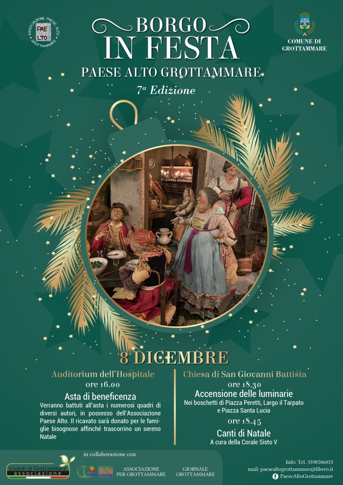 Un pomeriggio ricco quello di Mercoledì 8 Dicembre. Alle ore 16:00, presso l’Auditorium dell’Hospitale, ci sarà un’asta di beneficenza in cui verranno battuti numerosi quadri, di diversi autori, in possesso dell’Associazione Paese Alto. Il ricavato sarà donato alle famiglie bisognose affinché trascorrano un sereno Natale. Alle ore 18:30, ci sarà l’accensione delle luminarie nei boschetti di Piazza Peretti, Largo Il tarpato e Piazza Santa Lucia. A seguire, alle ore 18:45, presso la chiesa di San Giovanni Battista, si potranno ascoltare alcuni Canti di Natale a cura della Corale Sisto V.