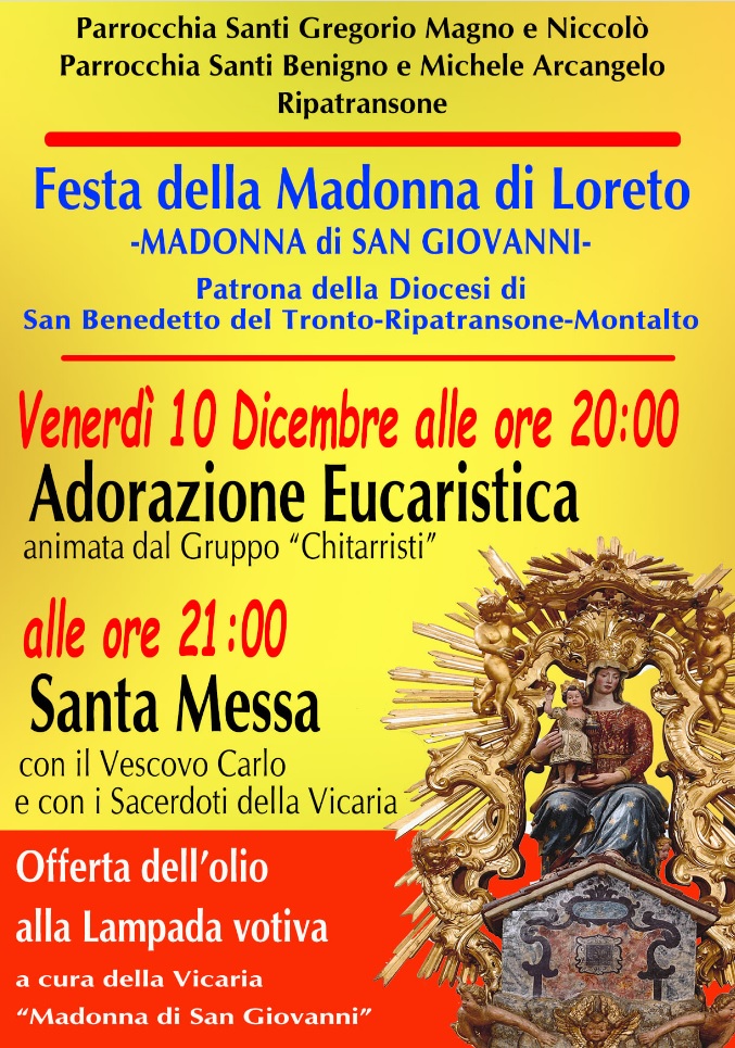 RIPATRANSONE – Come da tradizione il giorno della Madonna di Loreto, il 10 dicembre alle ore 21.00, il vescovo Bresciani presiederà una S. Messa a Ripatransone, nella concattedrale di San Gregorio Magno, dove si trova anche il santuario della Madonna di san Giovanni, patrona della diocesi.