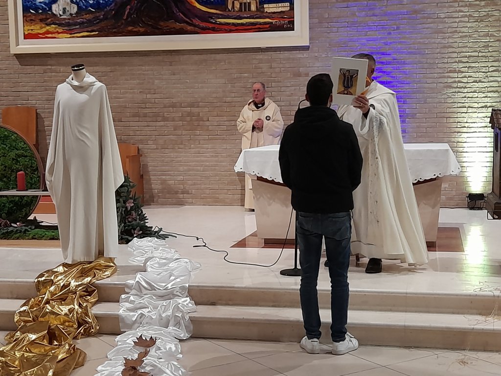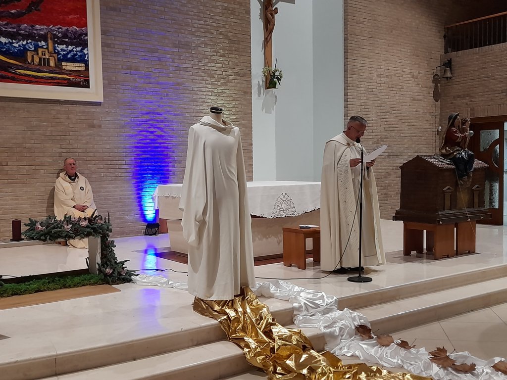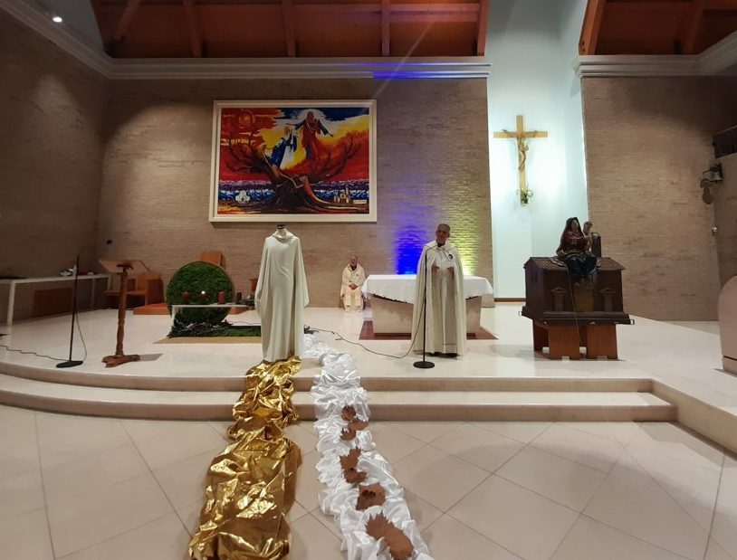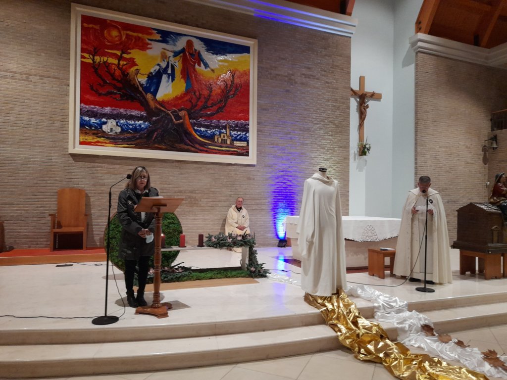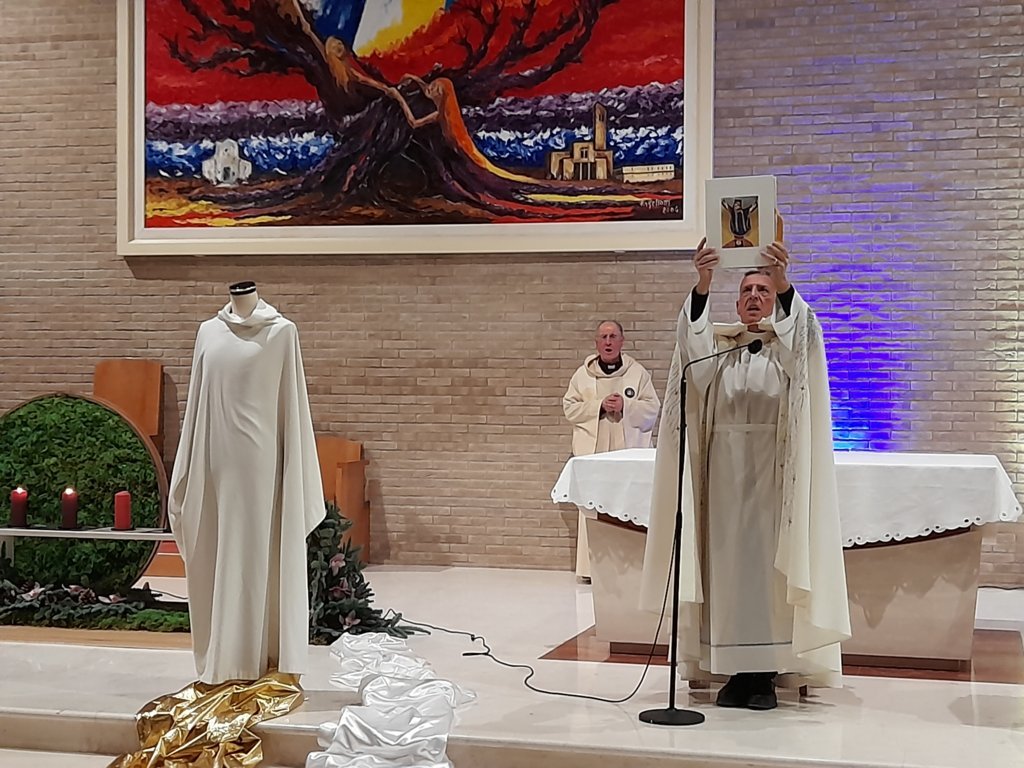 Stasera Maria vuole dirci: ‘Vestiti da Dio. Vestiti di Dio’. Vogliamo dunque chiedere alla Madonna di tessere un vestito nuovo, cucito bene addosso a noi. Maria stasera ci ridà il capo: con questo filo, siamo tutti parte della trama di Dio. Maria, infatti, è il tessuto nuovo, la trama che Dio aveva in mente. Lei ha tessuto Dio nella sua carne, così vogliamo fare anche noi. Perciò, adesso prenderò la spoletta che ho intrecciato nelle mani della Madonna e passerò un filo dorato tra tutti voi presenti: il gesto formerà la trama del tessuto nuovo e rimanderà anche al filo di un vestito che tiene insieme i vari pezzi e nessuno lo vede, se non il Sarto che ce l’ha messo. Poi opererò un taglio, ad esprimere il passaggio dal buio alla luce, come quando si nasce: bisogna un po’ tagliare prima di venire alla luce.”