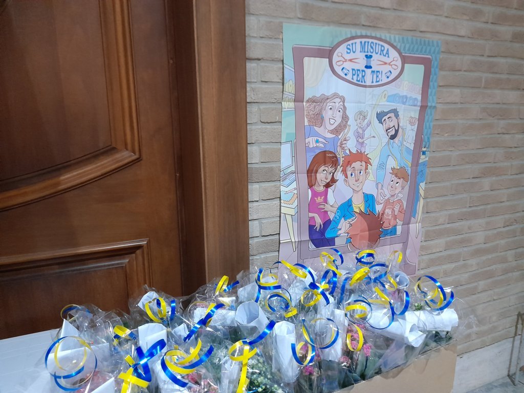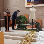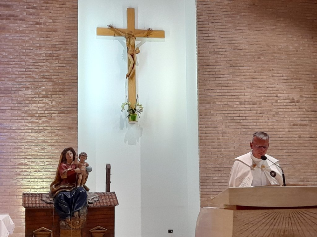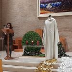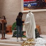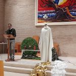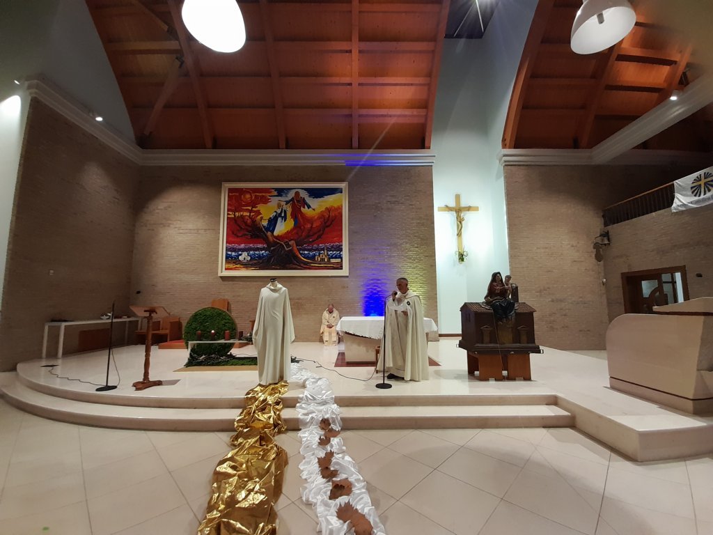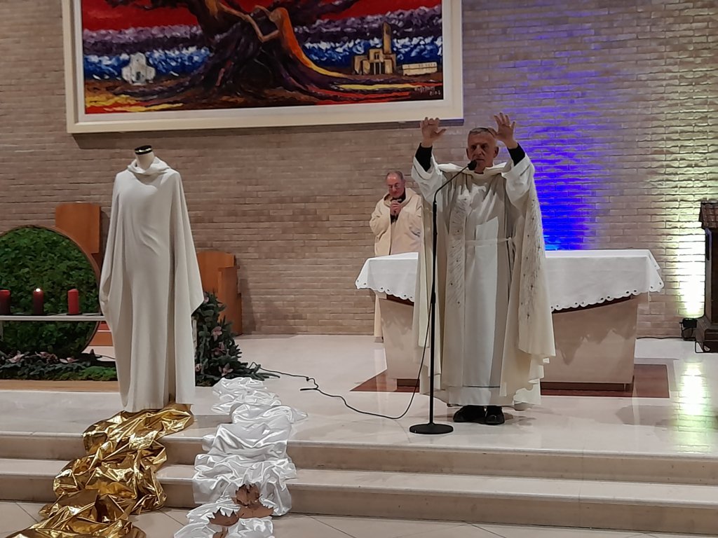Stasera Maria vuole dirci: ‘Vestiti da Dio. Vestiti di Dio’. Vogliamo dunque chiedere alla Madonna di tessere un vestito nuovo, cucito bene addosso a noi. Maria stasera ci ridà il capo: con questo filo, siamo tutti parte della trama di Dio. Maria, infatti, è il tessuto nuovo, la trama che Dio aveva in mente. Lei ha tessuto Dio nella sua carne, così vogliamo fare anche noi. Perciò, adesso prenderò la spoletta che ho intrecciato nelle mani della Madonna e passerò un filo dorato tra tutti voi presenti: il gesto formerà la trama del tessuto nuovo e rimanderà anche al filo di un vestito che tiene insieme i vari pezzi e nessuno lo vede, se non il Sarto che ce l’ha messo. Poi opererò un taglio, ad esprimere il passaggio dal buio alla luce, come quando si nasce: bisogna un po’ tagliare prima di venire alla luce.”