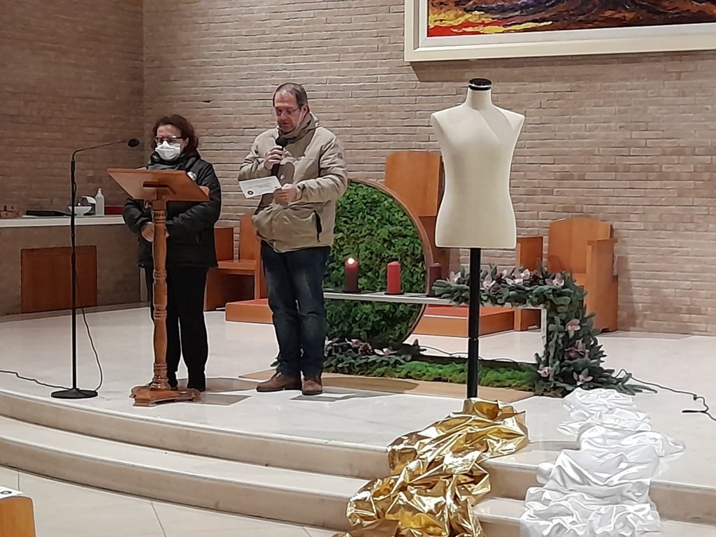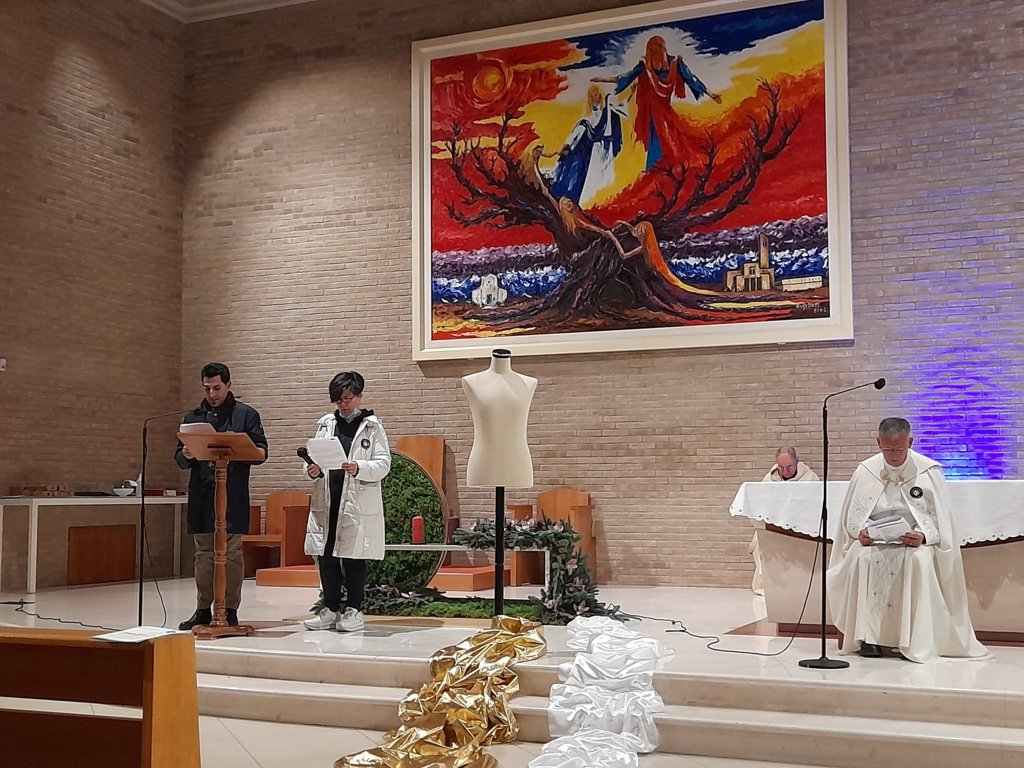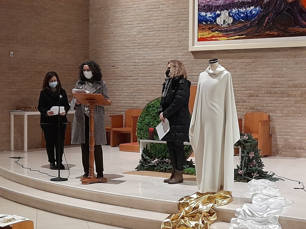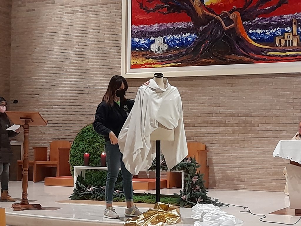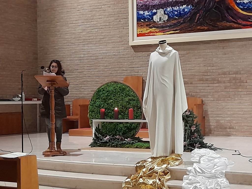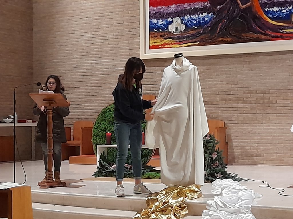 Durante la veglia gli animatori hanno sottolineato come il dialogo tra Dio e l’uomo assomigli all’incrociarsi tra i fili di ordito e i fili di trama in un tessuto. Dio stende i propri fili verticali – l’ordito, costituito dalla creazione del giardino in cui sono posti Adamo ed Eva – e dona all’uomo il filato orizzontale che serve a formare la trama, lasciando però a lui di farlo scorrere correttamente nell’ordito, cosicché si formi un buon tessuto. La stoffa di Dio, che l’amore, non si fa però senza spoletta. La spoletta di Maria ha creato un tessuto nuovo, manifestando perfettamente la trama che Dio aveva in mente. Adamo ha strappato il tessuto di Dio; Maria ha tessuto Dio nella sua carne. Durante la celebrazione sono stati compiuti alcuni gesti per simboleggiare questi concetti: prima alcuni presidenti parrocchiali hanno poggiato su un drappo bianco alcune foglie come invito a deporre le vecchie vesti e farsi rivestire di nuove vesti, quindi, a seguire, altri hanno portato una tunica sul manichino vicino all’altare, vestendolo con abiti nuovi.