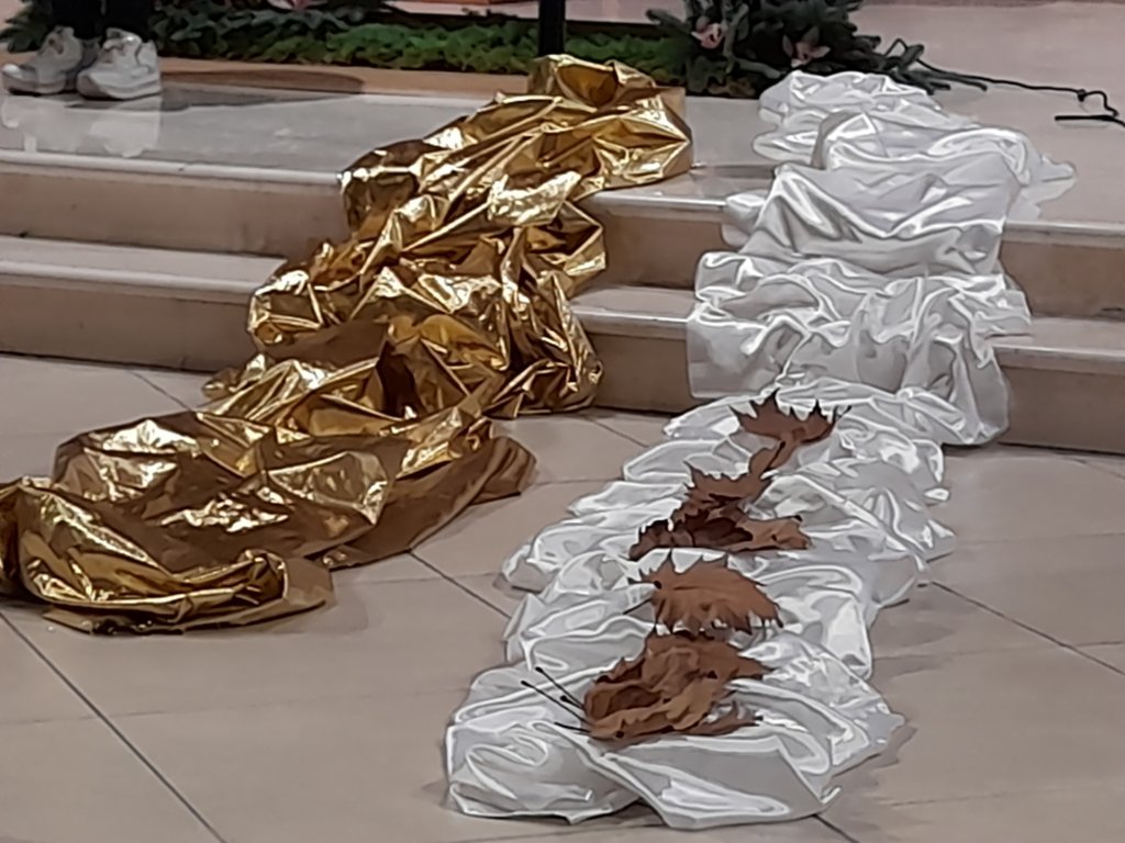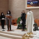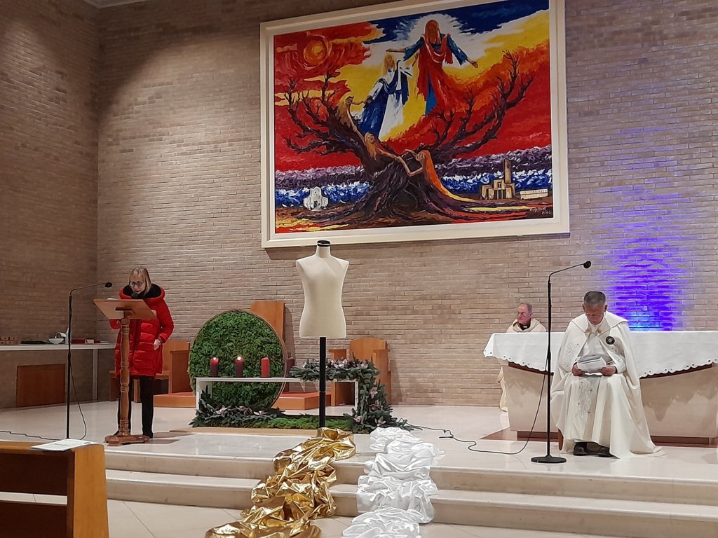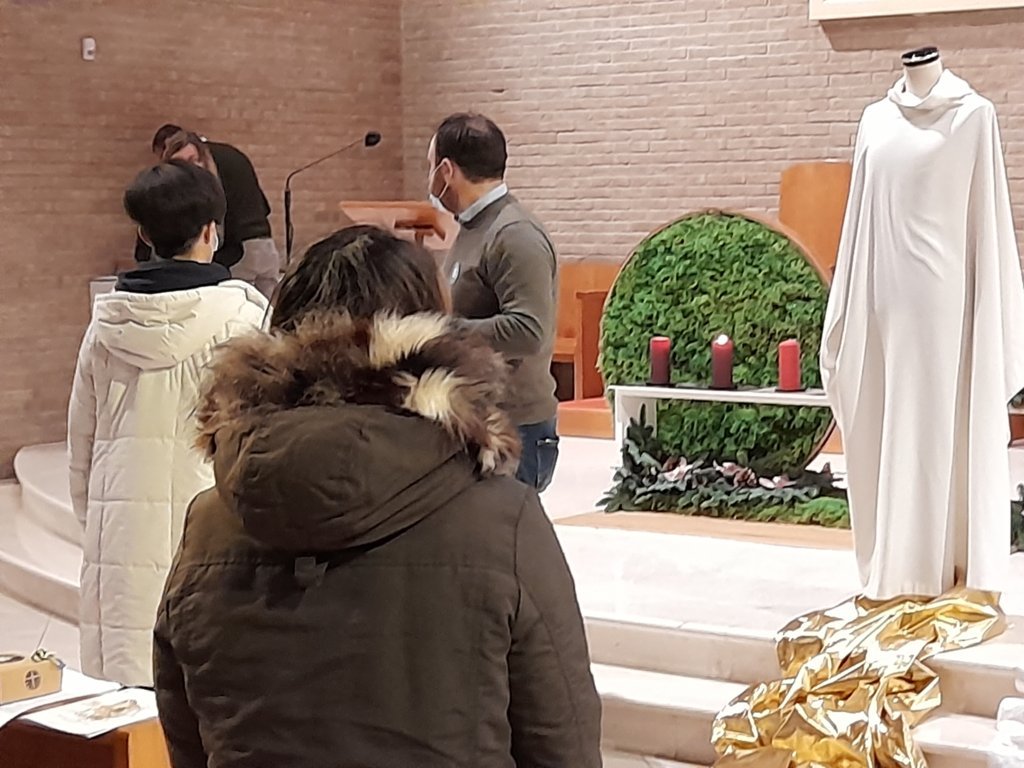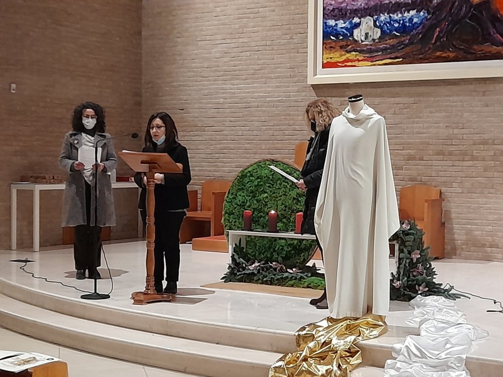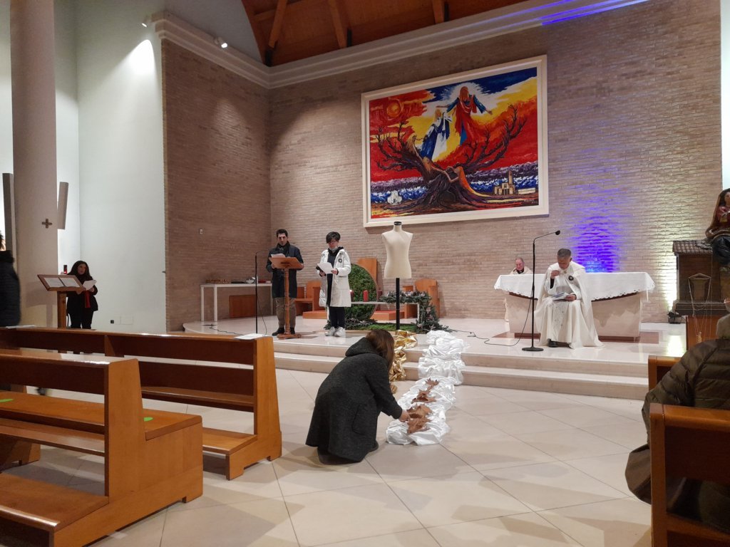 Durante la veglia gli animatori hanno sottolineato come il dialogo tra Dio e l’uomo assomigli all’incrociarsi tra i fili di ordito e i fili di trama in un tessuto. Dio stende i propri fili verticali – l’ordito, costituito dalla creazione del giardino in cui sono posti Adamo ed Eva – e dona all’uomo il filato orizzontale che serve a formare la trama, lasciando però a lui di farlo scorrere correttamente nell’ordito, cosicché si formi un buon tessuto. La stoffa di Dio, che l’amore, non si fa però senza spoletta. La spoletta di Maria ha creato un tessuto nuovo, manifestando perfettamente la trama che Dio aveva in mente. Adamo ha strappato il tessuto di Dio; Maria ha tessuto Dio nella sua carne. Durante la celebrazione sono stati compiuti alcuni gesti per simboleggiare questi concetti: prima alcuni presidenti parrocchiali hanno poggiato su un drappo bianco alcune foglie come invito a deporre le vecchie vesti e farsi rivestire di nuove vesti, quindi, a seguire, altri hanno portato una tunica sul manichino vicino all’altare, vestendolo con abiti nuovi.