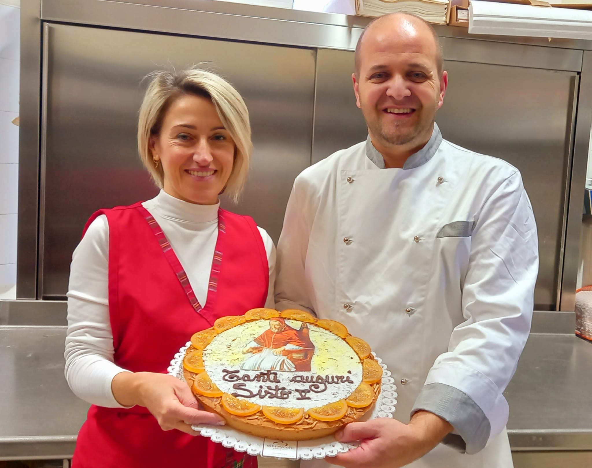 GROTTAMMARE – Non poteva mancare l’arancio nella torta di Sisto V. Al culmine delle celebrazioni sistine, il forno Ciarrocchi di Grottammare ha voluto omaggiare il grande pontefice con una torta di compleanno. Lo squisito dolce a base di mandorle, cioccolato ed arancio ha fatto la sua apparizione nell’ambito dell’evento musicale, organizzato dall’associazione “Euterpe e le Altre” nella chiesa di San Pio V proprio il giorno di santa Lucia, nel quale è nato a Grottammare Felice Peretti, salito al soglio pontificio col nome di Sisto V. Sormontato dalle simboliche 500 candeline e decorato con arance candite, ha conquistato per la sua bontà ed il profumo deciso di arancia gli artisti che si sono esibiti: la violinista Sonia Brevi, Michele Andrenazzi ( tromba), il soprano Elzaveta Shuvalova, Daniele Zaccari (flauto ed ottavino) ed il pianista Davide Massacci che ha seguito di Franz Liszt la celebre Fantasia quasi Sonata “Dopo una lettura di Dante. “ Una torta dall’impasto del frangipane con mandorle, cioccolato ed arancia, oltre agli ingredienti base, speciale e golosa per rendere omaggio al nostro grande concittadino- hanno spiegato Francesco e Sandra Ciarrocchi, titolari del forno di Grottammare- che si conserva per alcuni giorni. Eravamo da tempo alla ricerca di un dolce tipico di Grottammare, soprattutto per i turisti che chiedono le tipicità del luogo. Esiste il fristingo, ricco di ingredienti che si gusta sotto il periodo natalizio, ma improponibile d’estate, ora l’anniversario della nascita del grande papa nato nella nostra città, ci ha dato l’ispirazione per la Torta Sisto V dal sapore agrumato che potrebbe diventare il dolce tipico di Grottammare”. Una delizia unica che ha superato a pieni voti l’assaggio generale degli artisti che si sono esibiti nella chiesa di San Pio V.